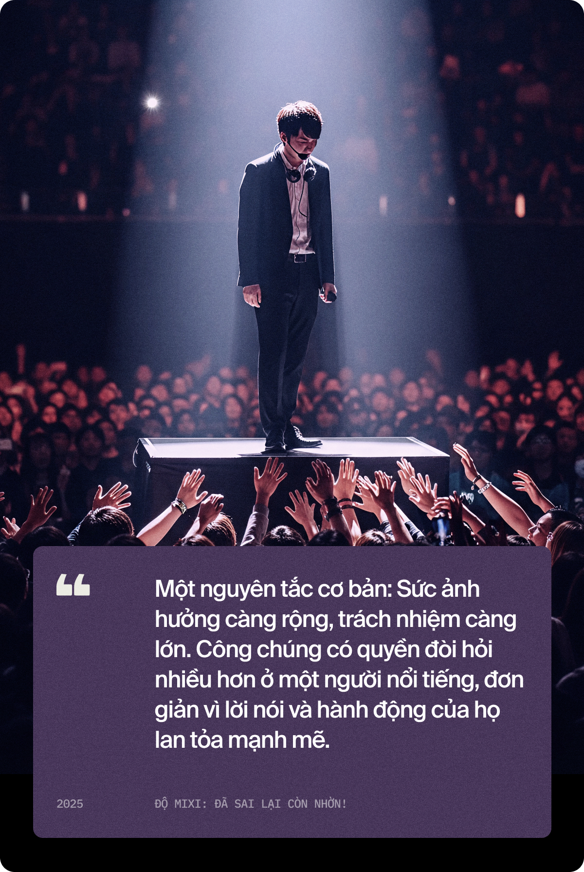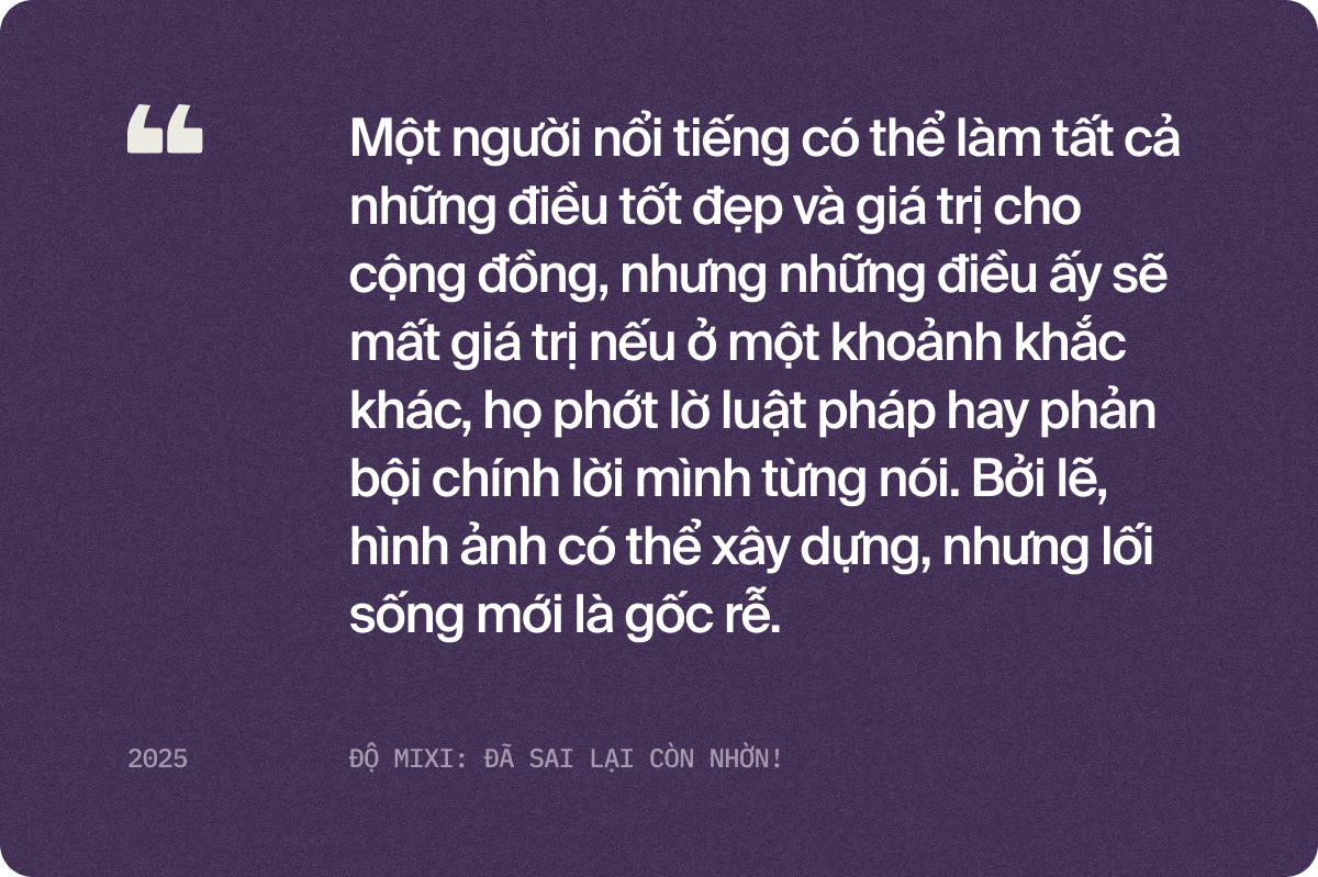Vụ việc của Độ Mixi cũng cho thấy một nghịch lý nhức nhối: Dù anh có từng làm bao nhiêu việc thiện, góp bao nhiêu cho cộng đồng, thì vi phạm vẫn là vi phạm. Người nổi tiếng không những không được phép “nhờn luật”, mà còn phải chịu trách nhiệm nặng nề hơn, vì tầm ảnh hưởng của họ lan ra xã hội, vượt xa phạm vi một cộng đồng fan.