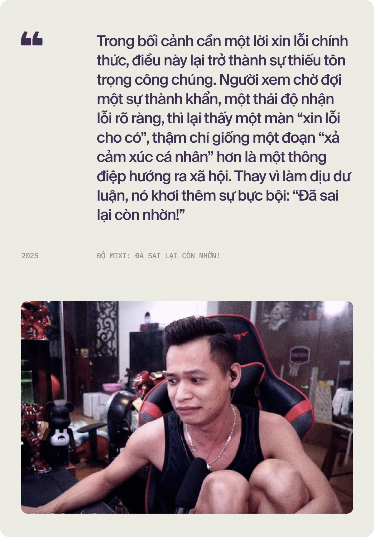 Nhưng khi sức ảnh hưởng vượt ra khỏi ranh giới ấy, luật chơi thay đổi. Độ Mixi không chỉ còn là streamer trong căn phòng máy tính của mình, mà đã trở thành gương mặt xuất hiện trên sóng truyền hình quốc gia... Từ đây, khán giả không còn gói gọn ở một cộng đồng quen thuộc, mà trải dài từ học sinh, phụ huynh đến công chúng cả nước. Và khi đó, chuẩn mực dành cho anh không thể chỉ dừng ở mức “fan hiểu và bỏ qua”.