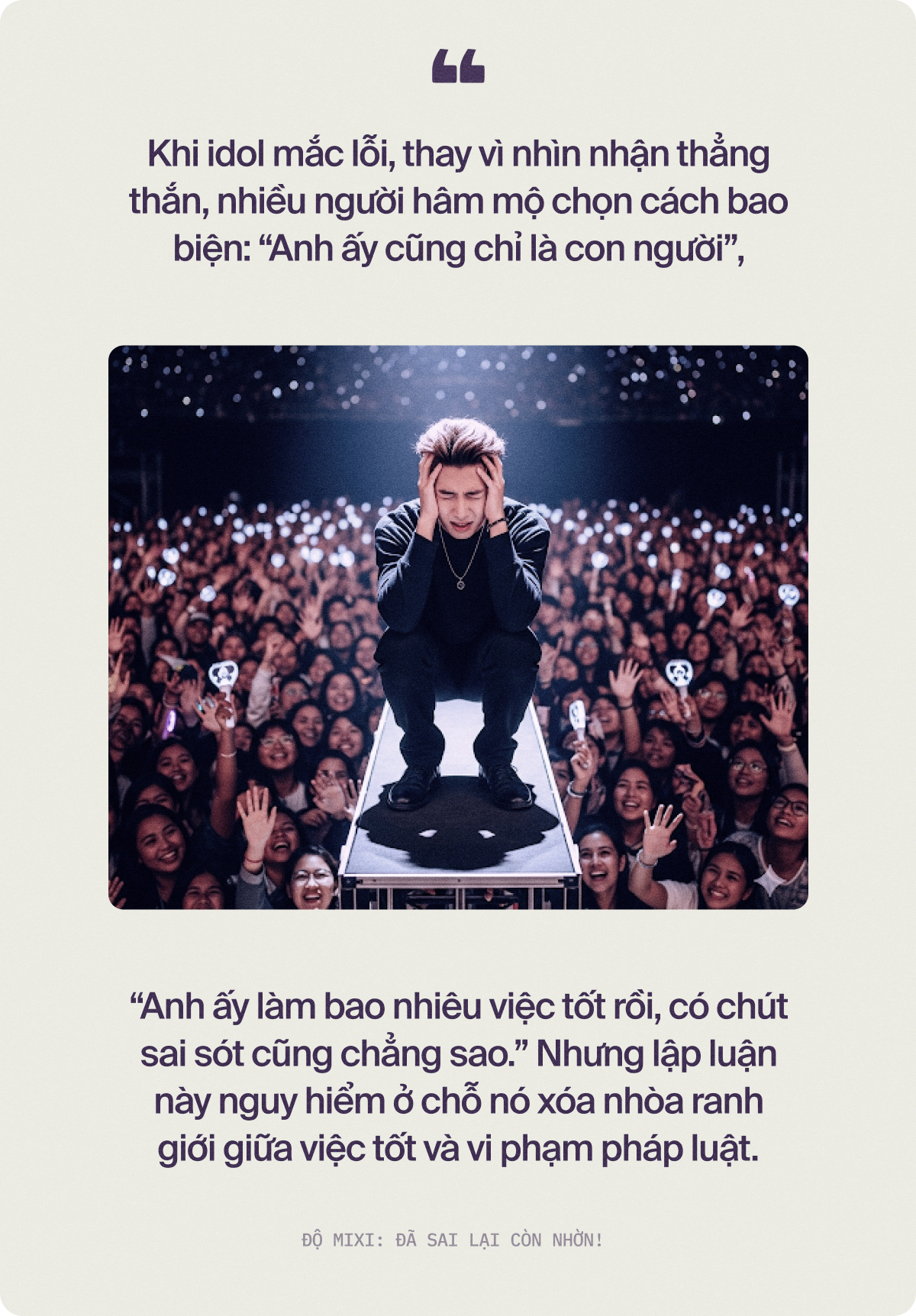Điều đáng lo ngại hơn, sự dễ dãi của một số fan lại vô tình tiếp tay cho sự bất cẩn. Khi idol mắc lỗi, thay vì nhìn nhận thẳng thắn, nhiều người hâm mộ chọn cách bao biện: “Anh ấy cũng chỉ là con người”, “Anh ấy làm bao nhiêu việc tốt rồi, có chút sai sót cũng chẳng sao.” Nhưng lập luận này nguy hiểm ở chỗ nó xóa nhòa ranh giới giữa việc tốt và vi phạm pháp luật. Làm từ thiện không thể biến hành vi trái luật thành hợp pháp. Tổ chức sự kiện dành cho cộng đồng hay lan tỏa thông điệp tích cực cũng không cho ai quyền phớt lờ quy định. Đặt lòng tốt ở một vế, đặt luật pháp ở vế còn lại để cân đong đo đếm là một sự ngụy biện. Và sự ngụy biện này, khi được nhân lên bởi hàng triệu fan, sẽ trở thành một áp lực xã hội méo mó: Idol sai cũng phải thành đúng.
