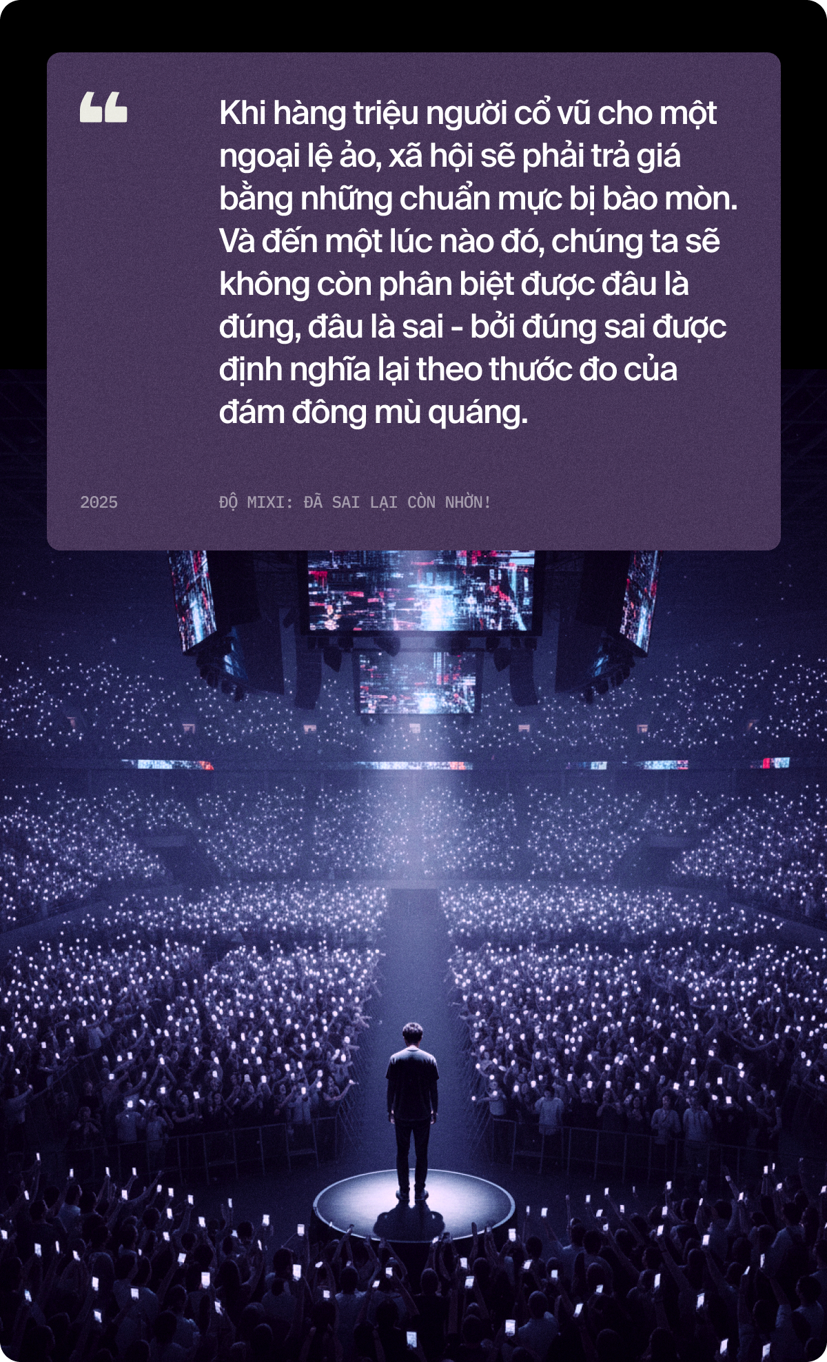Văn hóa thần tượng, nếu không được kiểm soát, sẽ biến những sai lầm của cá nhân thành “vết nứt hệ thống”. Khi hàng triệu người cổ vũ cho một ngoại lệ ảo, xã hội sẽ phải trả giá bằng những chuẩn mực bị bào mòn. Và đến một lúc nào đó, chúng ta sẽ không còn phân biệt được đâu là đúng, đâu là sai - bởi đúng sai được định nghĩa lại theo thước đo của đám đông mù quáng.