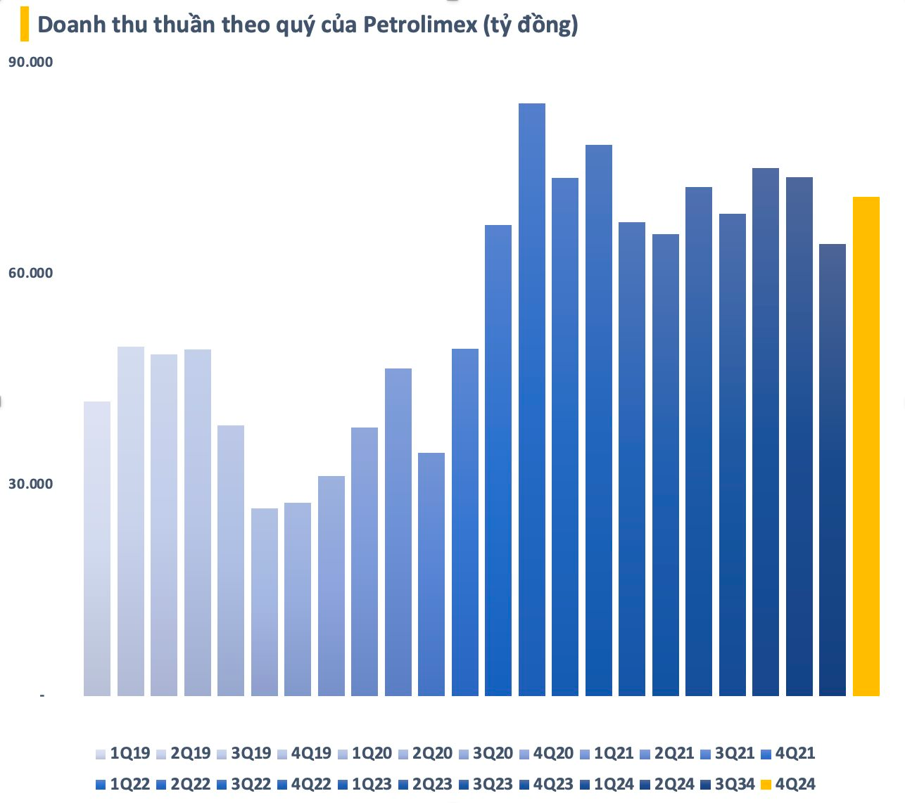 Theo BCTC hợp nhất quý 4/2024, Petrolimex ghi nhận doanh thu thuần đạt hơn 71.000 tỷ đồng, tăng nhẹ so với cùng kỳ. Trừ đi giá vốn, lãi gộp đạt 4.600 tỷ đồng, tăng 16% so với cùng kỳ 2023.