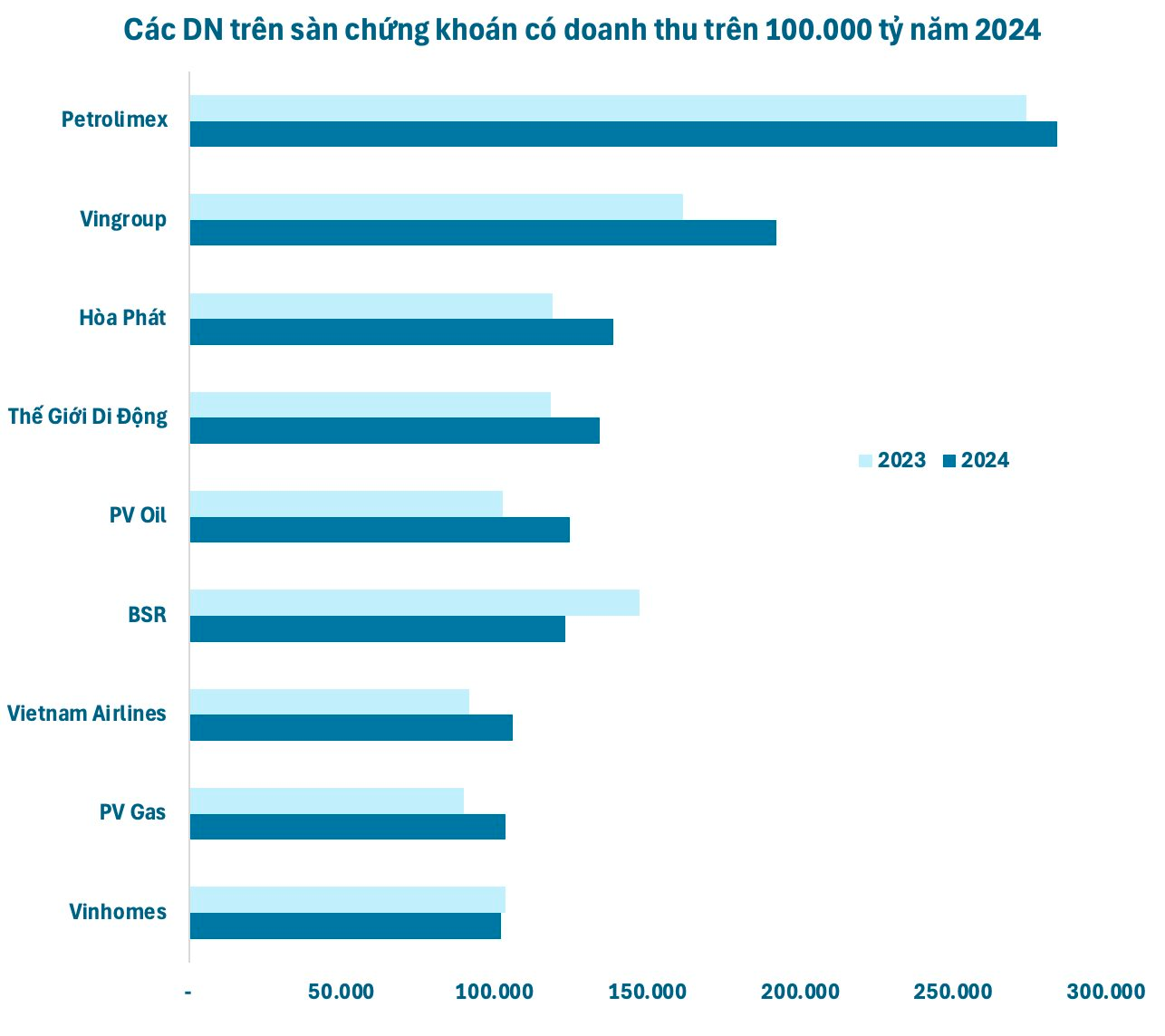 Tính chung cả năm 2024, Petrolimex ghi nhận doanh thu thuần đạt hơn 284.000 tỷ đồng, tăng 4% so với cùng kỳ và là mức cao nhất sàn chứng khoán tính đến hiện tại. Ước tính mỗi ngày đại gia bán lẻ xăng dầu này thu về gần 780 tỷ đồng.