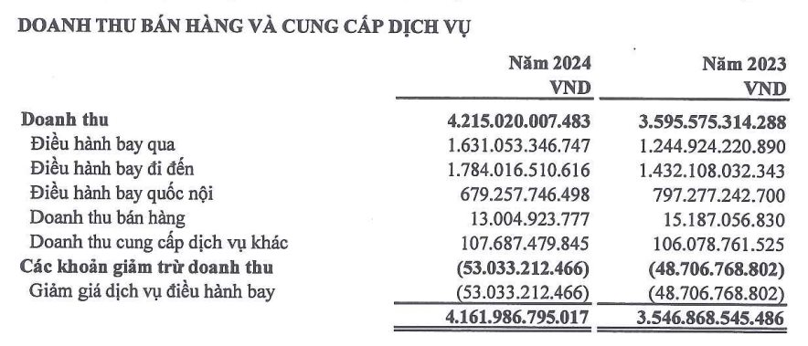 Theo báo cáo tài chính hợp nhất năm 2024, VATM ghi nhận doanh thu thuần hợp nhất năm 2024 đạt 4.162 tỷ đồng, trong đó, chủ yếu đến từ doanh thu điều hành bay qua, bay đi đến, bay quốc nội.