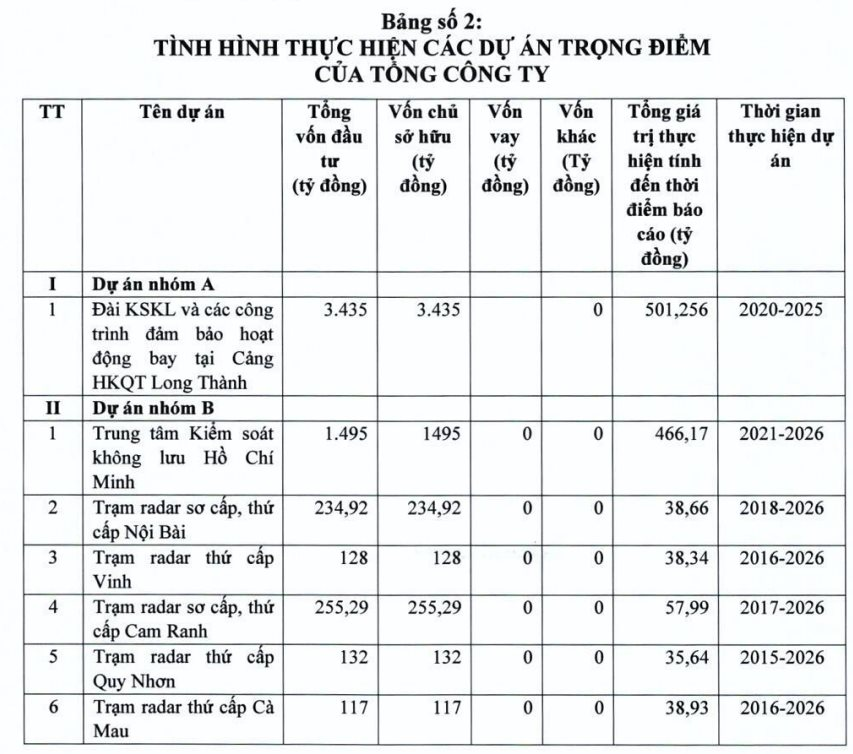 Công ty đang thực hiện 102 dự án, trong đó gồm 1 dự án nhóm A (Dự án thành phần 2: Các công trình phục vụ quản lý bay thuộc dự án cảng HKQT Long Thành giai đoạn 1); 27 dự án nhóm B và 74 dự án nhóm C.