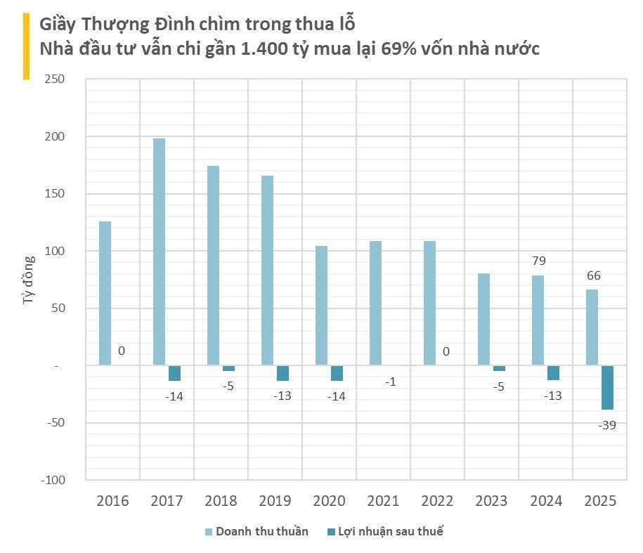 Về kết quả kinh doanh, năm 2025, Giầy Thượng Đình ghi nhận doanh thu thuần hơn 66 tỷ đồng, giảm 16% so với năm 2024. Lỗ sau thuế gần 39 tỷ đồng. Lỗ lũy kế tính tới cuối năm 2025 gần 106 tỷ đồng.