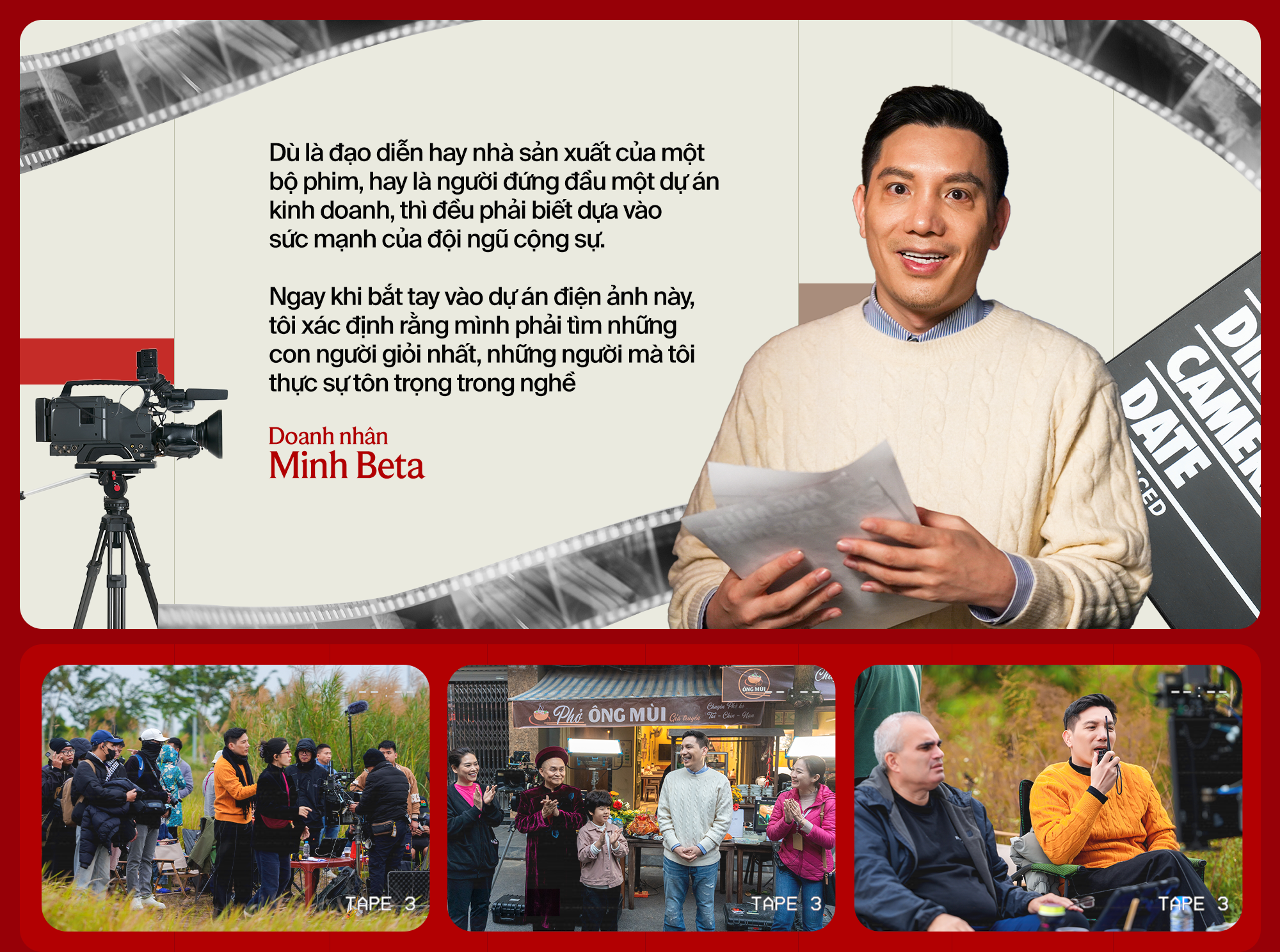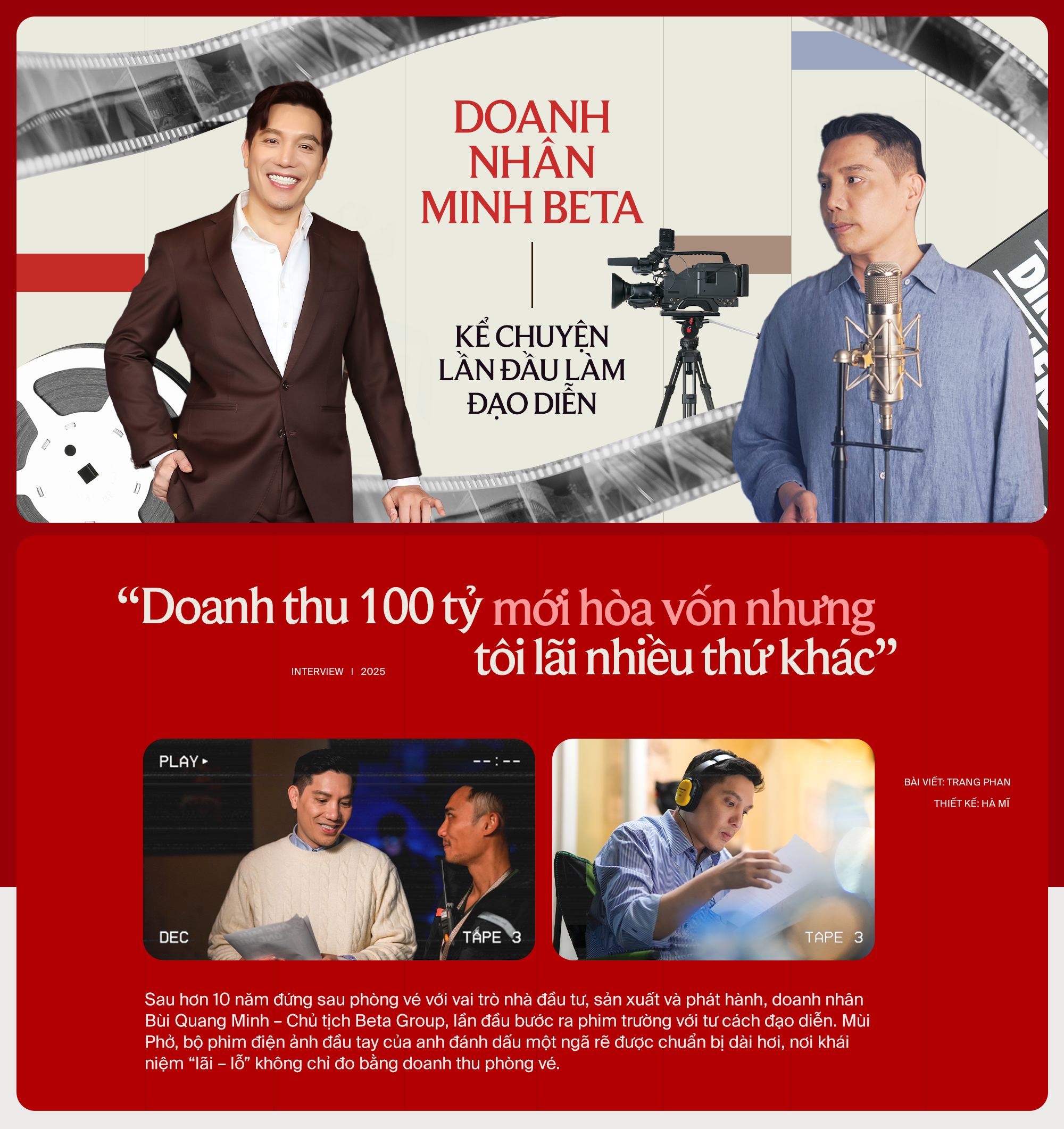 Ở tuổi 42, sau hơn một thập kỷ xây dựng chuỗi 21 cụm rạp đã vận hành ổn định, anh Bùi Quang Minh, Chủ tịch Beta Group (còn được biết đến với tên gọi là Minh Beta), chọn làm một việc khác với thói quen của mình: rời phòng họp để bước ra phim trường.