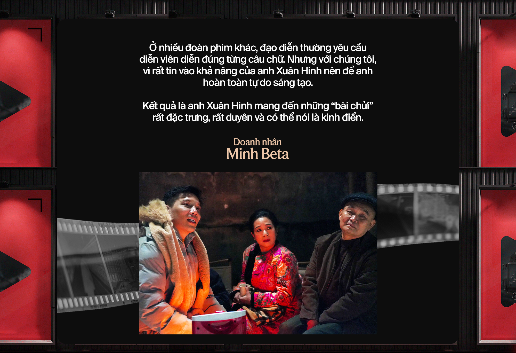 Ở nhiều đoàn phim khác, đạo diễn thường yêu cầu diễn viên diễn đúng từng câu chữ. Nhưng với chúng tôi, vì rất tin vào khả năng của anh Xuân Hinh nên để anh hoàn toàn tự do sáng tạo.