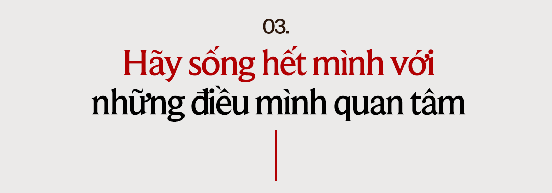 Nếu cứ nghĩ rằng đã làm doanh nhân thì chỉ nên tập trung vào những con số, dự án, công việc văn phòng, thì chắc chắn tôi sẽ không có được sự nghiệp như ngày hôm nay. Có thể sự nghiệp đó theo tiêu chí của nhiều người không phải là điều gì quá to lớn, nhưng với cá nhân tôi, tôi rất tự hào về công việc, cuộc sống và con đường tôi đang xây dựng, bởi vì tôi đã sống hết tôi với những điều tôi quan tâm.