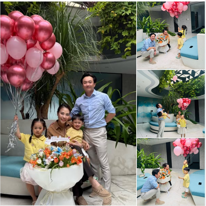 Loạt ảnh gia đình hạnh phúc được chụp trong không gian sang trọng, ngập tràn bóng bay hồng và hoa tươi. Hai con nhỏ trong trang phục đồng điệu càng làm nổi bật niềm vui. Hành trình 6 năm của cặp đôi không chỉ là tình yêu mà còn là minh chứng cho gia đình bền vững.
