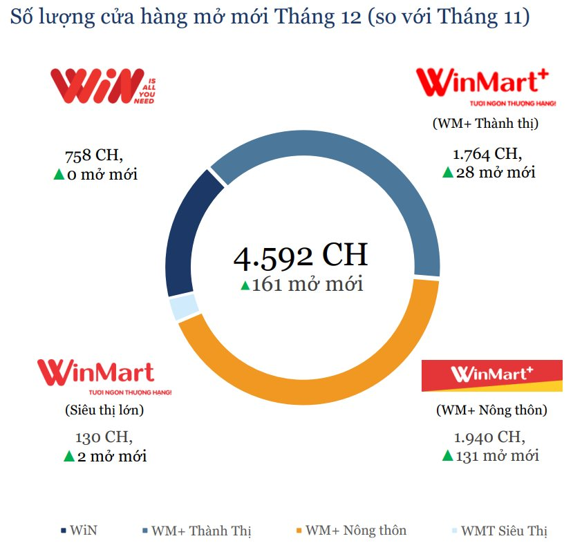 Tính riêng trong tháng 12/2025, tổng doanh thu WCM đạt 3.557 tỷ đồng, tăng 19% so với cùng kỳ năm ngoái. Tăng trưởng LFL của các cửa hàng trong tháng 12 tăng 8,6% so với cùng kỳ 2024. Trong đó, doanh thu thuần tăng mạnh nhất ở mô hình WinMart+ Nông thôn với mức tăng 48,8%. Còn đóng góp lớn nhất vào doanh thu thuần của WCM vẫn là mô hình WinMart+ Thành thị.