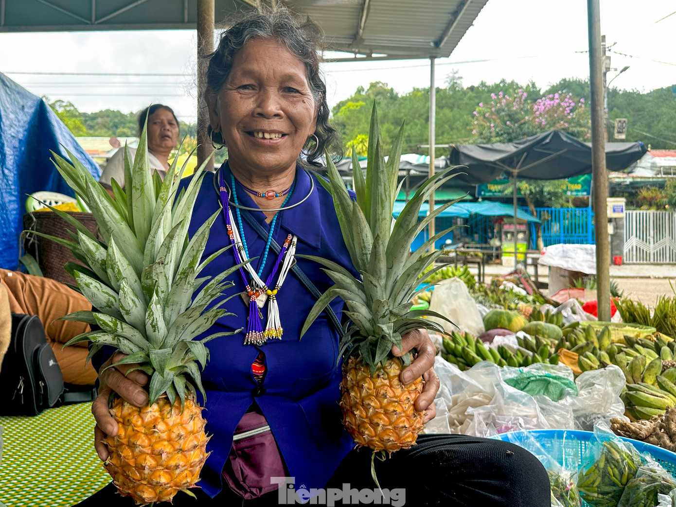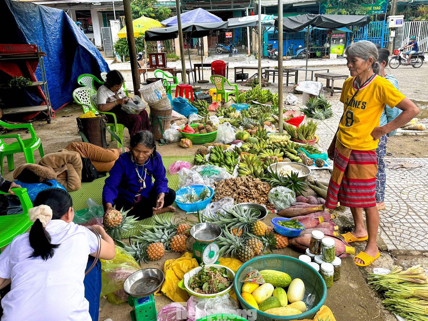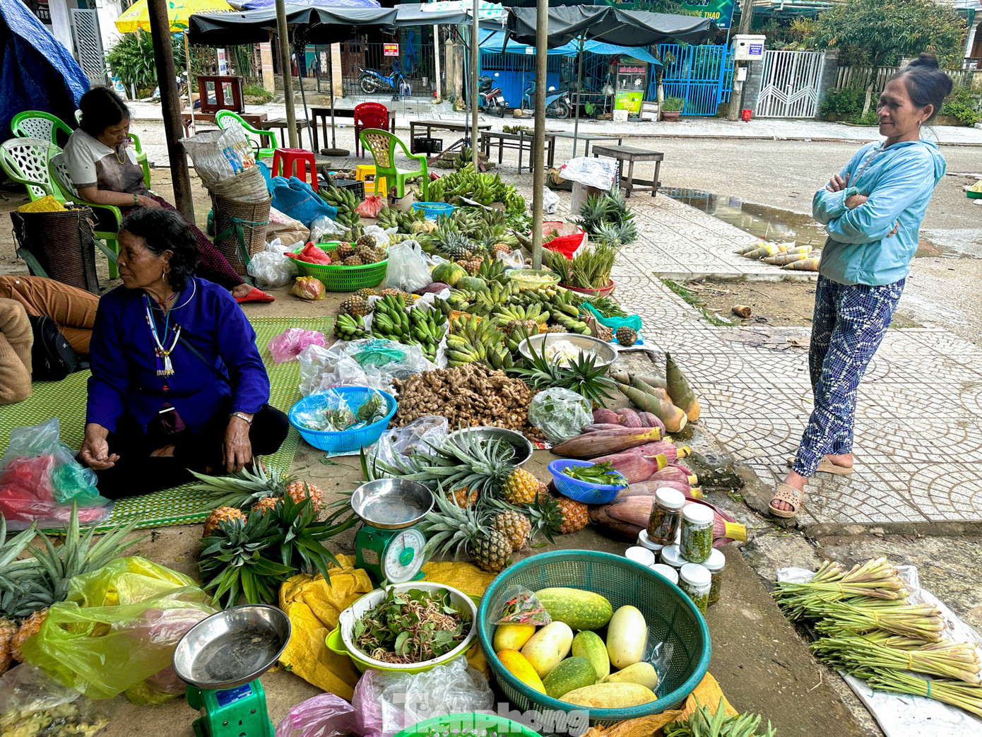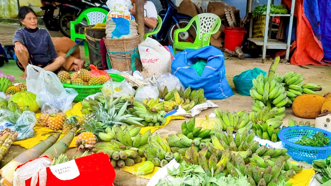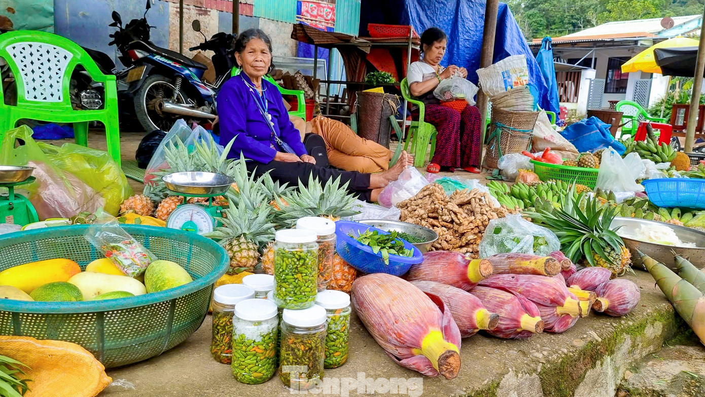 Ngay cạnh trung tâm xã Tây Giang, từ sáng sớm, "chợ 5 ngàn" đã mở phiên. Không biển hiệu, không quầy sạp cầu kỳ, chợ chỉ đơn giản là vài chiếc bàn tre cũ kỹ, vài tấm ni lông trải dưới đất. Người bán là bà con từ các thôn bản, xách theo gùi, bày ra những gì vừa thu hoạch từ nương rẫy như mớ rau, vài trái bắp, ít măng, nải chuối rừng hay những quả thơm chín vàng. Tất cả đều được “niêm yết” một cách giản dị, đồng giá 5.000 đồng.