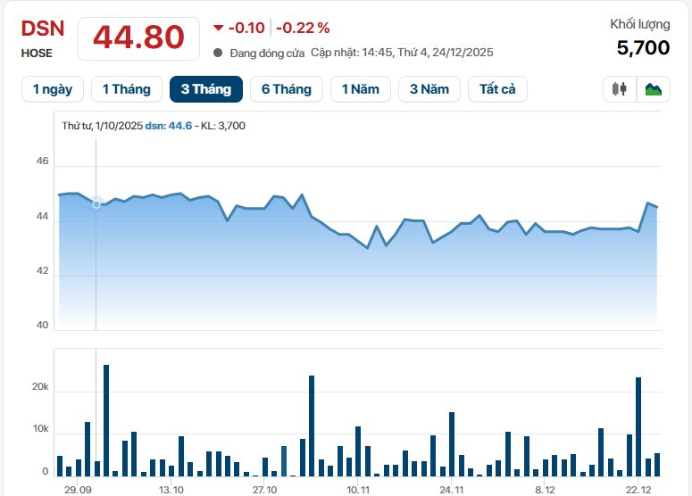 Trên thị trường, cổ phiếu DSN chốt phiên giao dịch 24/12 ở mốc 44.800 đồng/cp, giảm 14% so với hồi đầu năm.