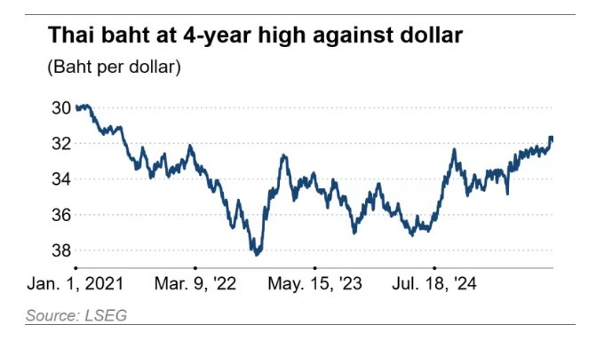 Tờ Nikkei Asian Review cho hay đồng baht Thái Lan đang nổi lên như đồng tiền mạnh nhất khu vực Đông Nam Á kể từ đầu năm 2025, khi tăng tới gần 8% so với đồng USD.