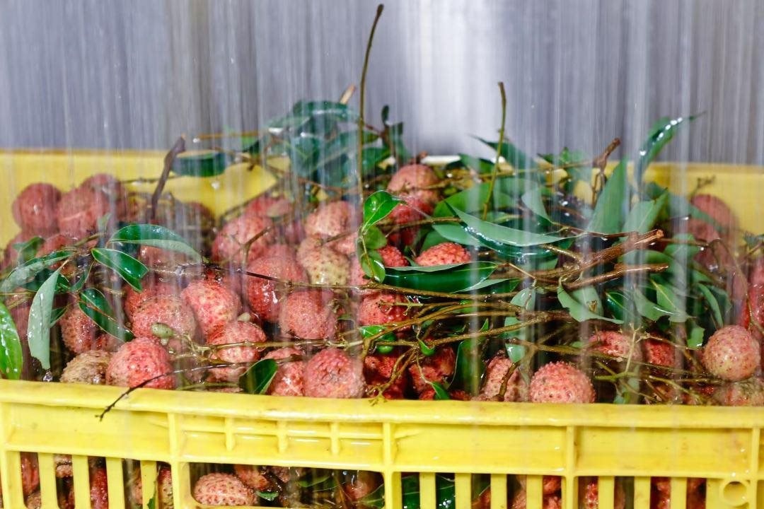 Ngay sau khi vải được hái, nông dân nhanh chóng đưa vào xưởng sơ chế trong vườn để “tắm lạnh” bằng thiết bị làm mát nhanh di động kết hợp phun sương tích trữ lạnh. Giáo sư Quách Gia Minh từ Học viện Công trình Đại học Nông nghiệp Hoa Nam cho biết, thiết bị này giải quyết bài toán làm mát nhanh sau thu hoạch. Chỉ trong 10 phút, vải có thể hạ nhiệt từ 30°C xuống 5°C. Sau đó, vải được đóng gói kèm túi đá giữ lạnh, có thể bảo quản tươi ngon hơn 4 ngày, kéo dài quãng đường và thời gian vận chuyển, thậm chí thay thế vận chuyển bằng đường hàng không bằng phương thức vận chuyển nhanh đường bộ, giảm mạnh chi phí logistics.