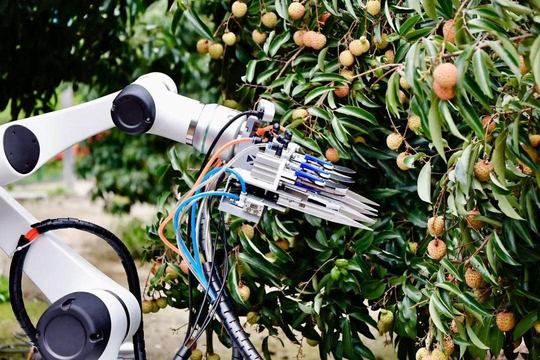 Trên sườn đồi vườn vải, robot hái vải với cánh tay robot sáu bậc tự do kết hợp bộ kẹp mềm mô phỏng sinh học, do Giáo sư Hùng Tuấn Đào từ Đại học Nông nghiệp Hoa Nam dẫn đầu phát triển, đang vận hành thu hái vải. Robot có thể vận hành liên tục, hiện đã được thử nghiệm tại 5 thành phố thuộc tỉnh Quảng Đông, chủ yếu cho thuê để phục vụ nông dân. Với việc thay đổi đầu kẹp, robot có thể hái đa dạng các loại quả như vải, kiwi, ổi...