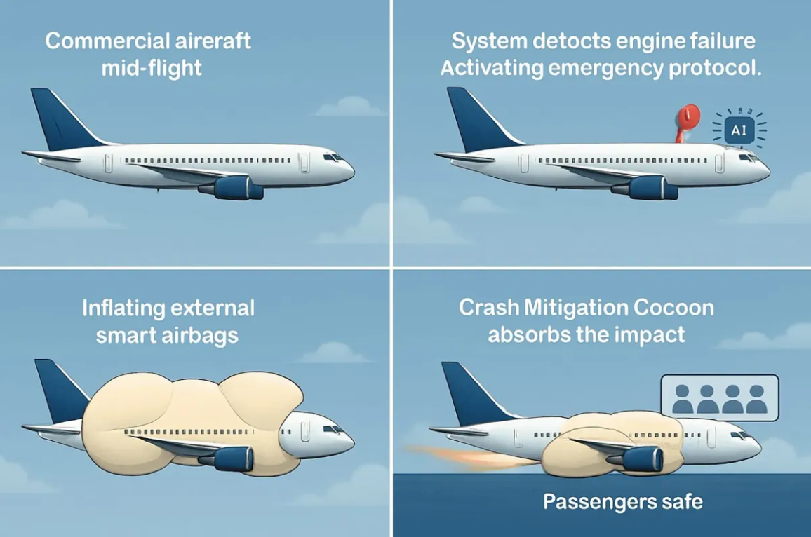 Các cảm biến và phần mềm AI có thể phát hiện khi nguy cơ rơi máy bay sắp xảy ra, từ đó kích hoạt triển khai túi khí siêu tốc tại mũi, bụng và đuôi giúp máy bay tiếp đất trong tình huống khẩn cấp mà không tạo ra va chạm dữ dội hay nổ tung.