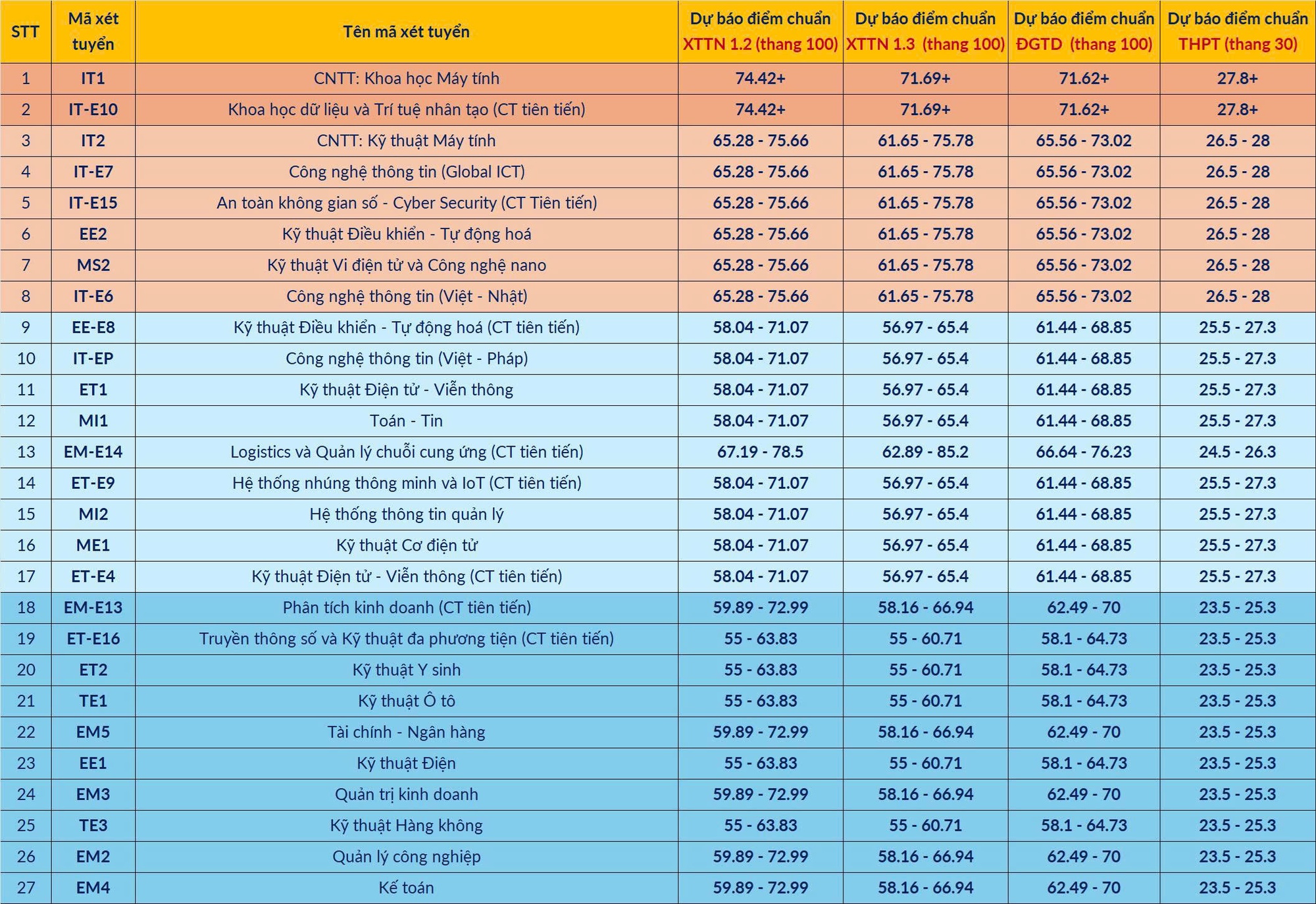 Căn cứ theo các loại phổ điểm và dữ liệu tuyển sinh các năm trước đây, Đại học Bách khoa Hà Nội dự báo mức điểm trúng tuyển vào các chương trình đạo tạo đại học chính quy năm 2025 như sau: