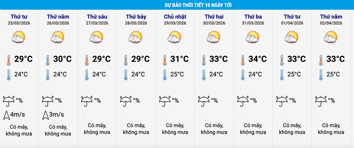 Theo bảng cập nhật thời tiết và nhiệt độ 10 ngày tới, Hà Nội có mây, không mưa trong các ngày 25-28/3, nhiệt độ cao nhất dao động 29-30°C, thấp nhất 24°C.