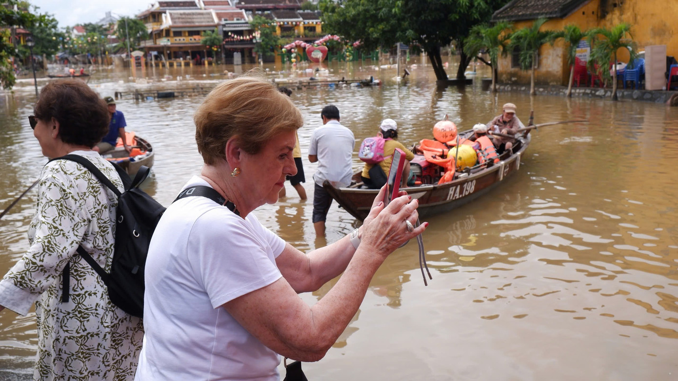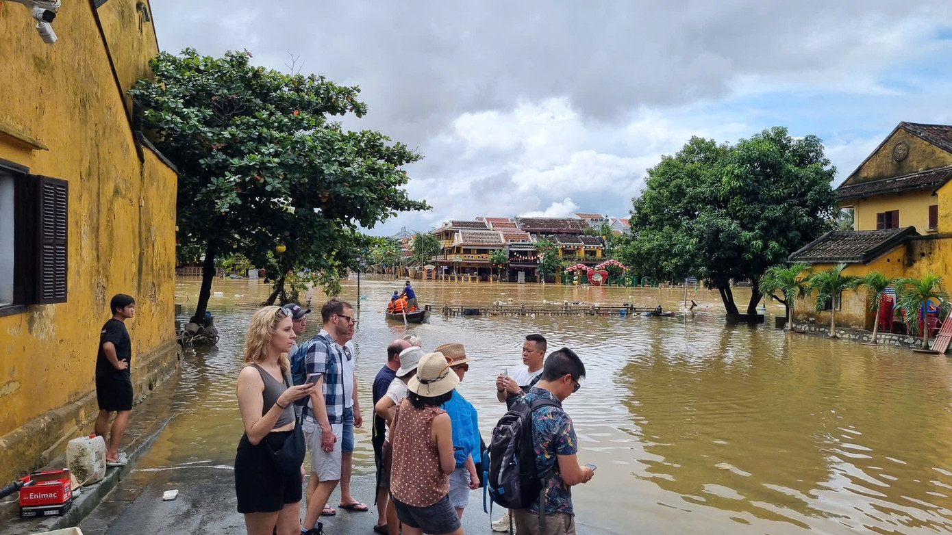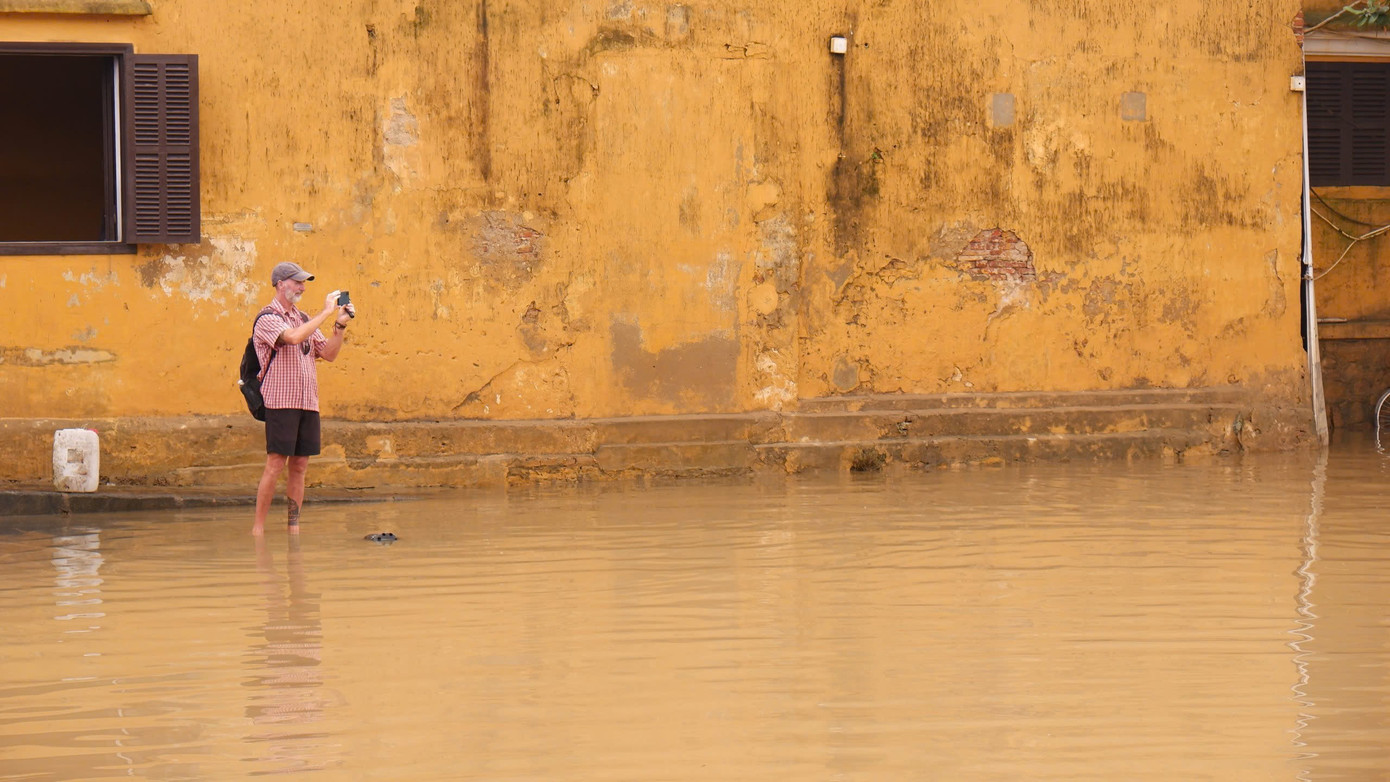Nước vừa rút, lực lượng chức năng và người dân khẩn trương dọn dẹp sau lũ nên hoạt động tham quan tạm thời chưa mở cửa. Tuy nhiên, rất đông du khách trở lại Hội An, bì bõm lội lụt, ghi lại hình ảnh phố cổ sau lũ.