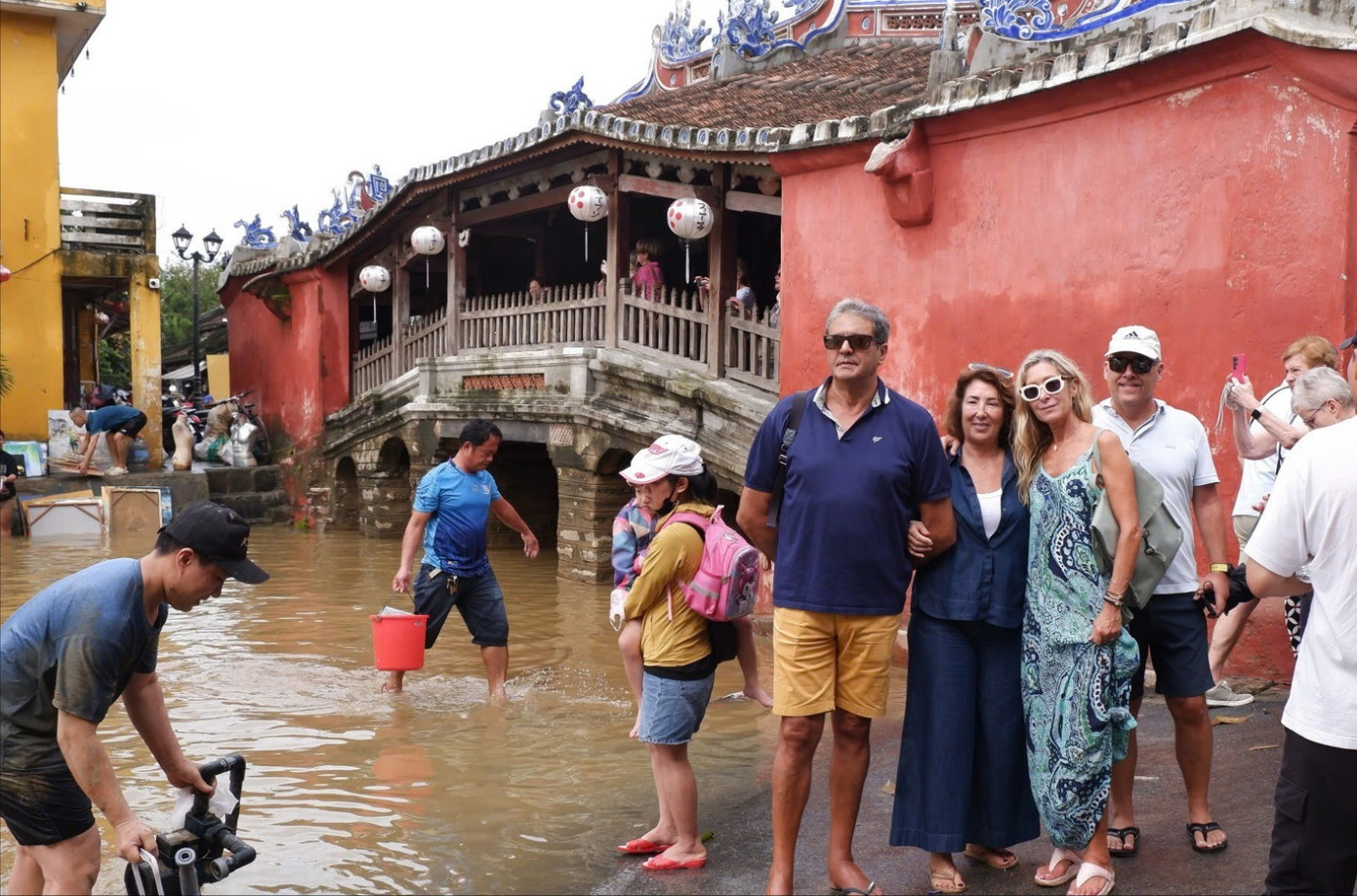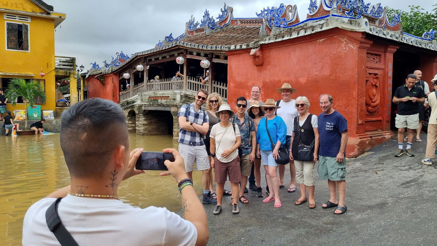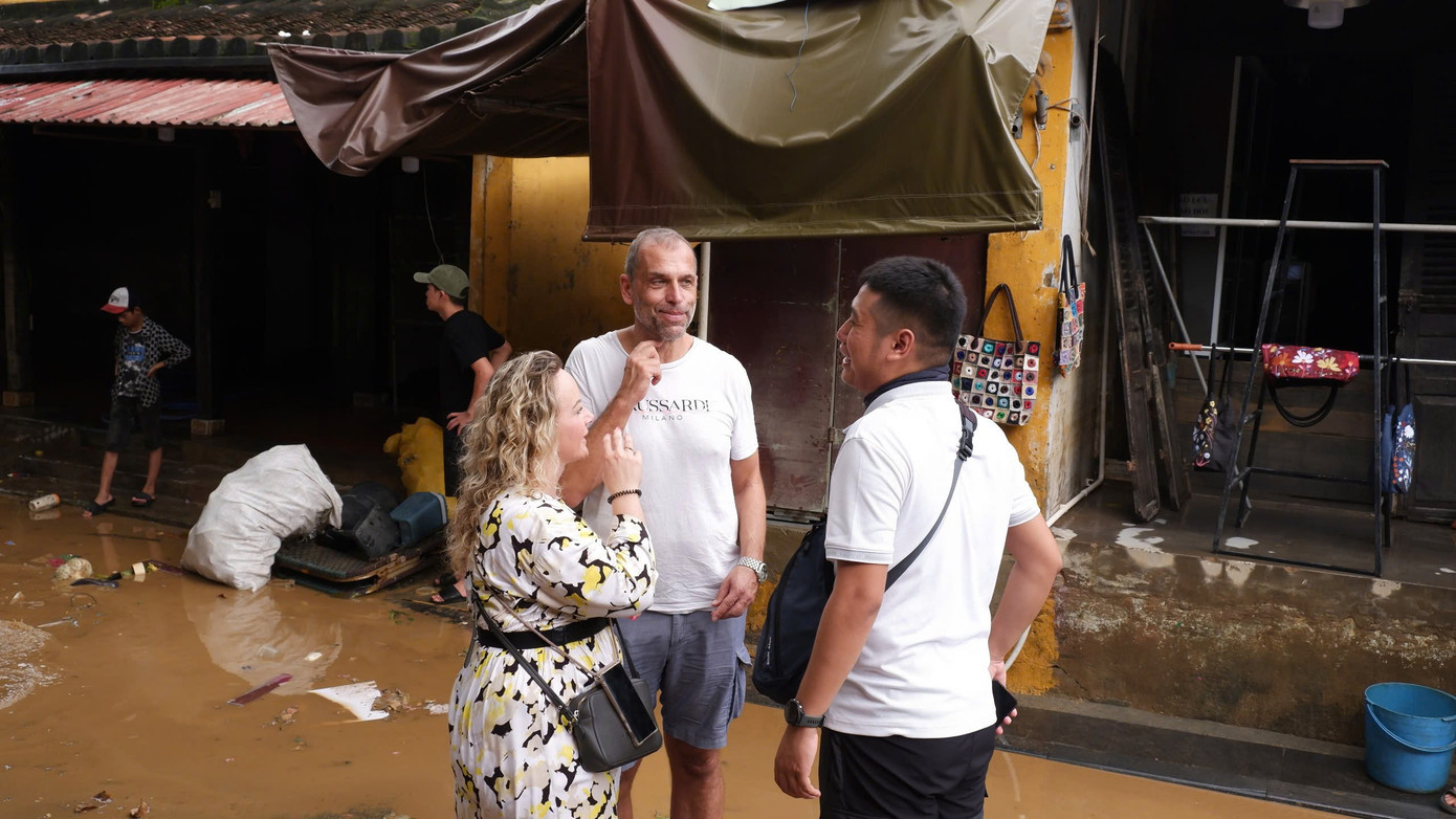 Nước vừa rút, lực lượng chức năng và người dân khẩn trương dọn dẹp sau lũ nên hoạt động tham quan tạm thời chưa mở cửa. Tuy nhiên, rất đông du khách trở lại Hội An, bì bõm lội lụt, ghi lại hình ảnh phố cổ sau lũ.