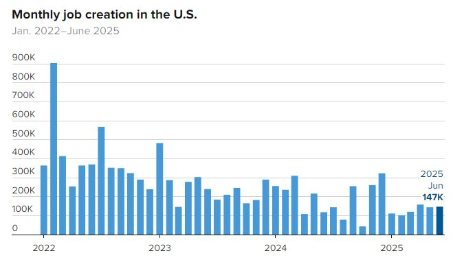 Kinh tế Mỹ đã tạo thêm 147.000 việc làm phi nông nghiệp mới trong tháng 6, tăng từ mức 144.000 trong tháng 5. Con số này vượt xa mức dự báo 110.000 của các nhà kinh tế do Dow Jones khảo sát.