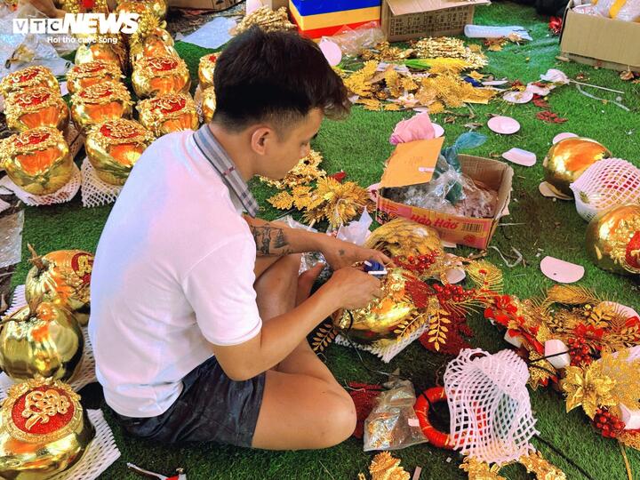 “ Chúng tôi bắt đầu làm từ tháng 9 âm lịch, sớm hơn mọi năm. Đến nay đã gần ba tháng gia công liên tục, với khoảng 8.000 sản phẩm được hoàn thiện ”, anh Tú nói.
