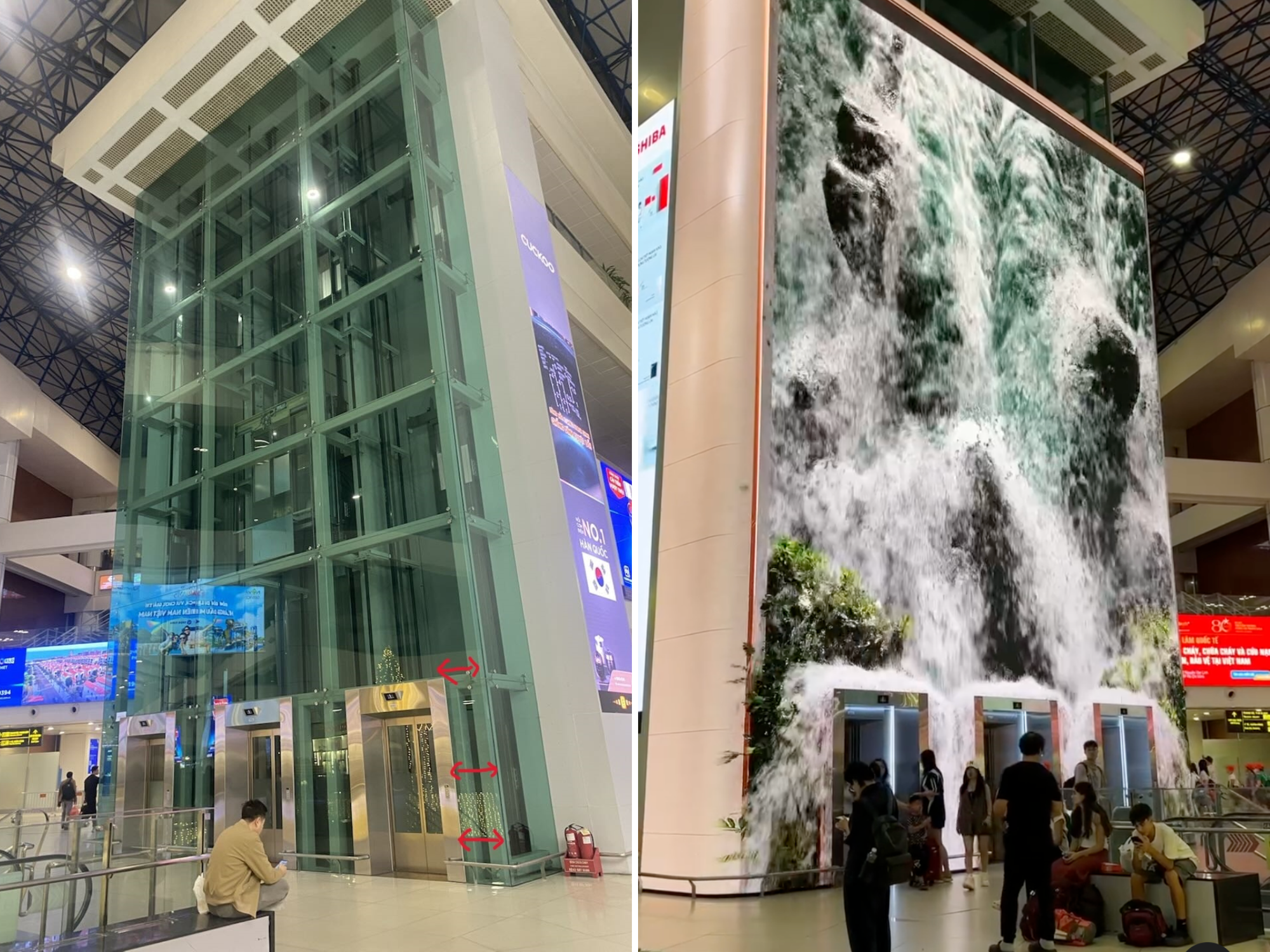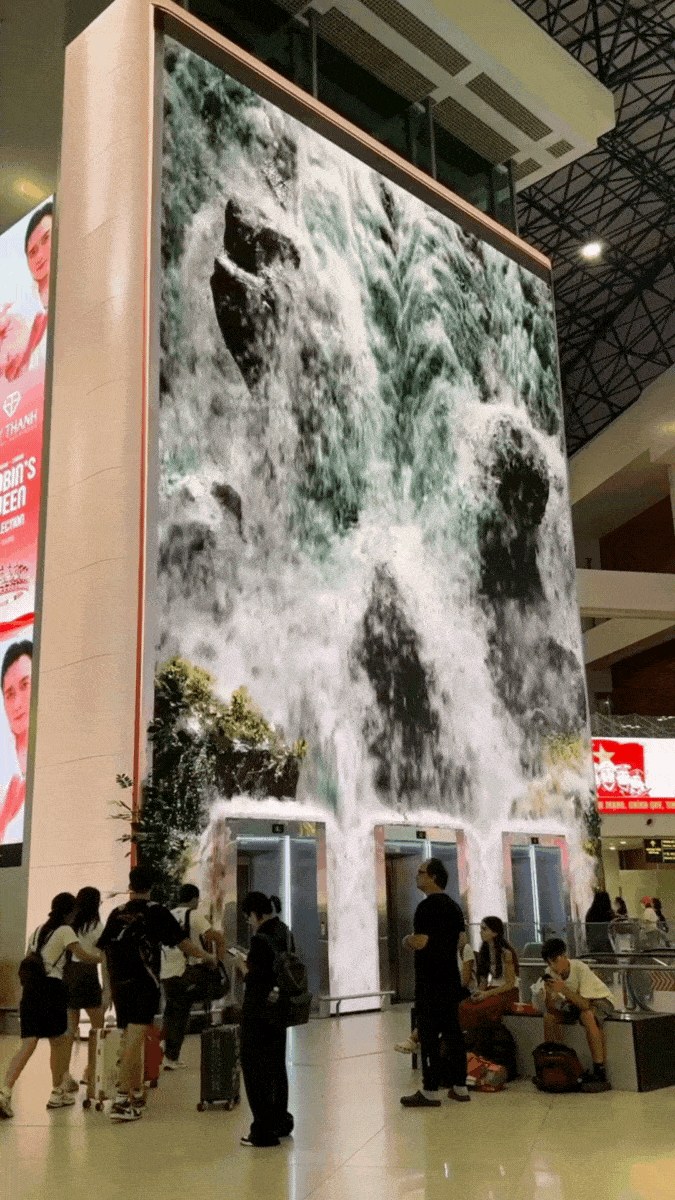 Đây là một màn hình led được thi công ngay tại thang máy của nhà ga nội địa Nội Bài. Màn hình này trình chiếu một đoạn video thác nước chảy vô cùng sống động, tạo ra ảo ảnh thị giác như một dòng nước mát lành đang đổ xuống ngay trước cửa thang máy. Hiệu ứng này mang đến một cảm giác vừa hùng vĩ, vừa thư thái cho hành khách trong lúc chờ đợi.
