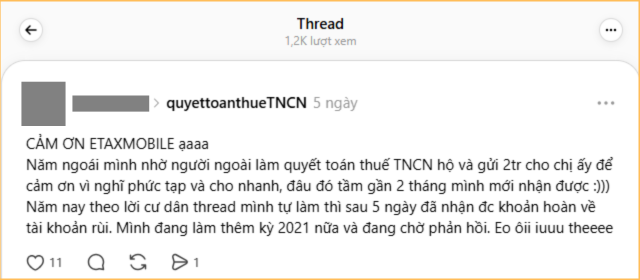 Một người khác mới nhận được tiền hoàn thuế TNCN cũng có chia sẻ tương tự: Thử khai thuế trên eTax Mobile xong thấy nhanh gọn hơn thao tác trên website, “vào bấm bấm là xong”.