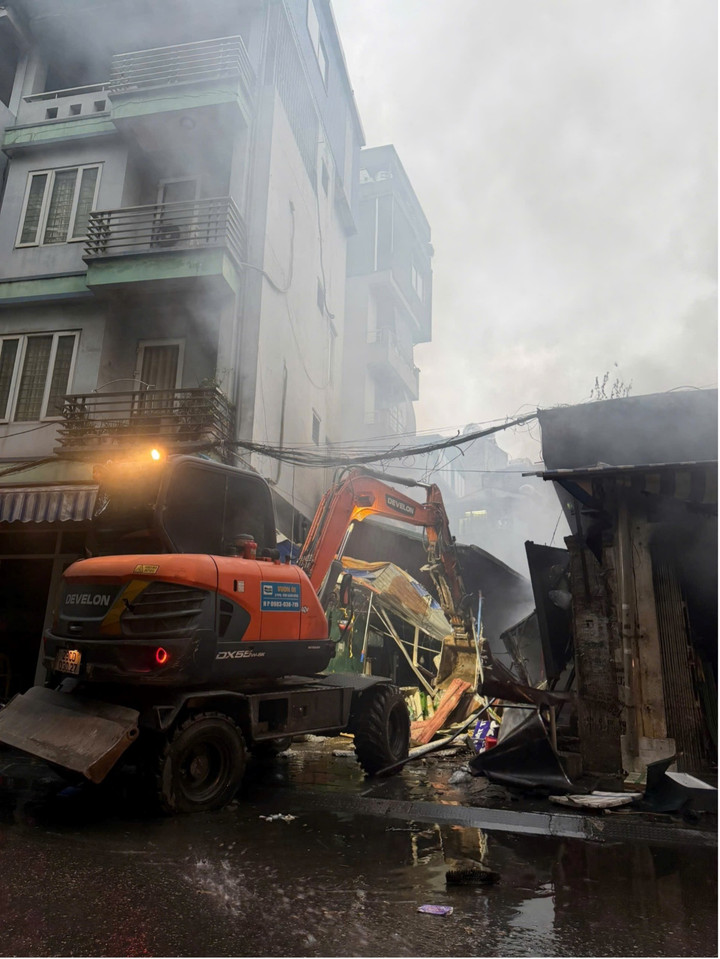 Dùng máy xúc phá dỡ, mở đường cho cảnh sát dập tắt đám cháy chợ ở Hà Nội