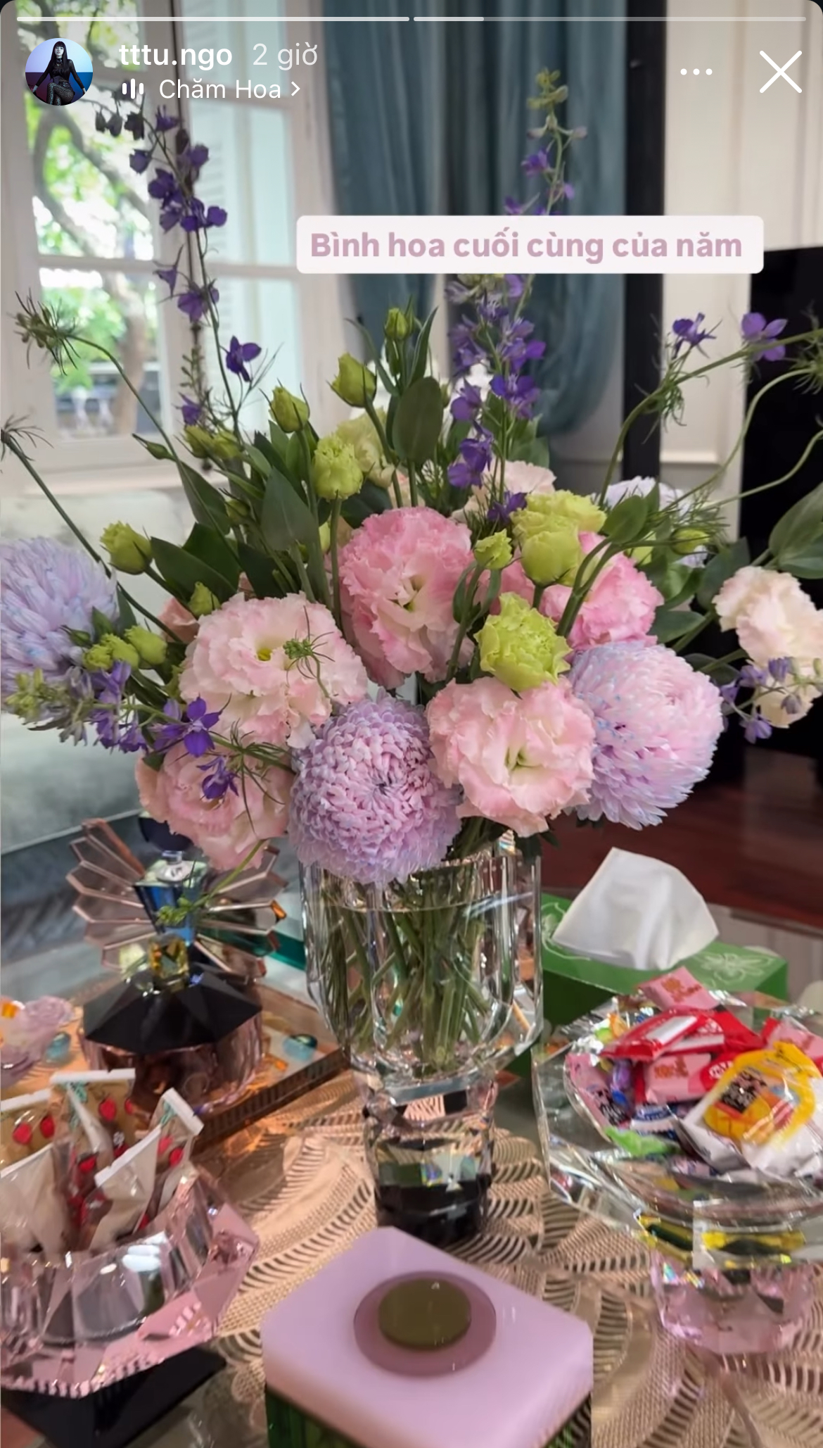Bên cạnh Tăng Thanh Hà và Lan Khuê, nhiều mỹ nhân Vbiz khác như Midu, Hương Liên, Diễm My... cũng không đứng ngoài cuộc chơi "flex" nhà cửa. Từ những bình hoa cao quá đầu người, cành đào, mai kích thước khủng cho đến những mâm cỗ được chuẩn bị công phu, tất cả góp phần tạo nên bức tranh 29 Tết đầy rộn ràng.