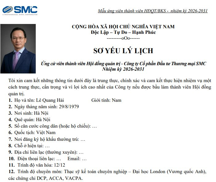 Công ty Cổ phần Ðầu tư Thương mại SMC (mã: SMC) đã công bố Nghị quyết HĐQT về danh sách ứng viên hợp lệ để bầu cử thành viên Hội đồng quản trị, Ban kiểm soát nhiệm kỳ 2026-2031.