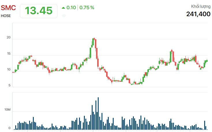 Chốt phiên 10/4, thị giá SMC đạt 13.350 đồng/cp.