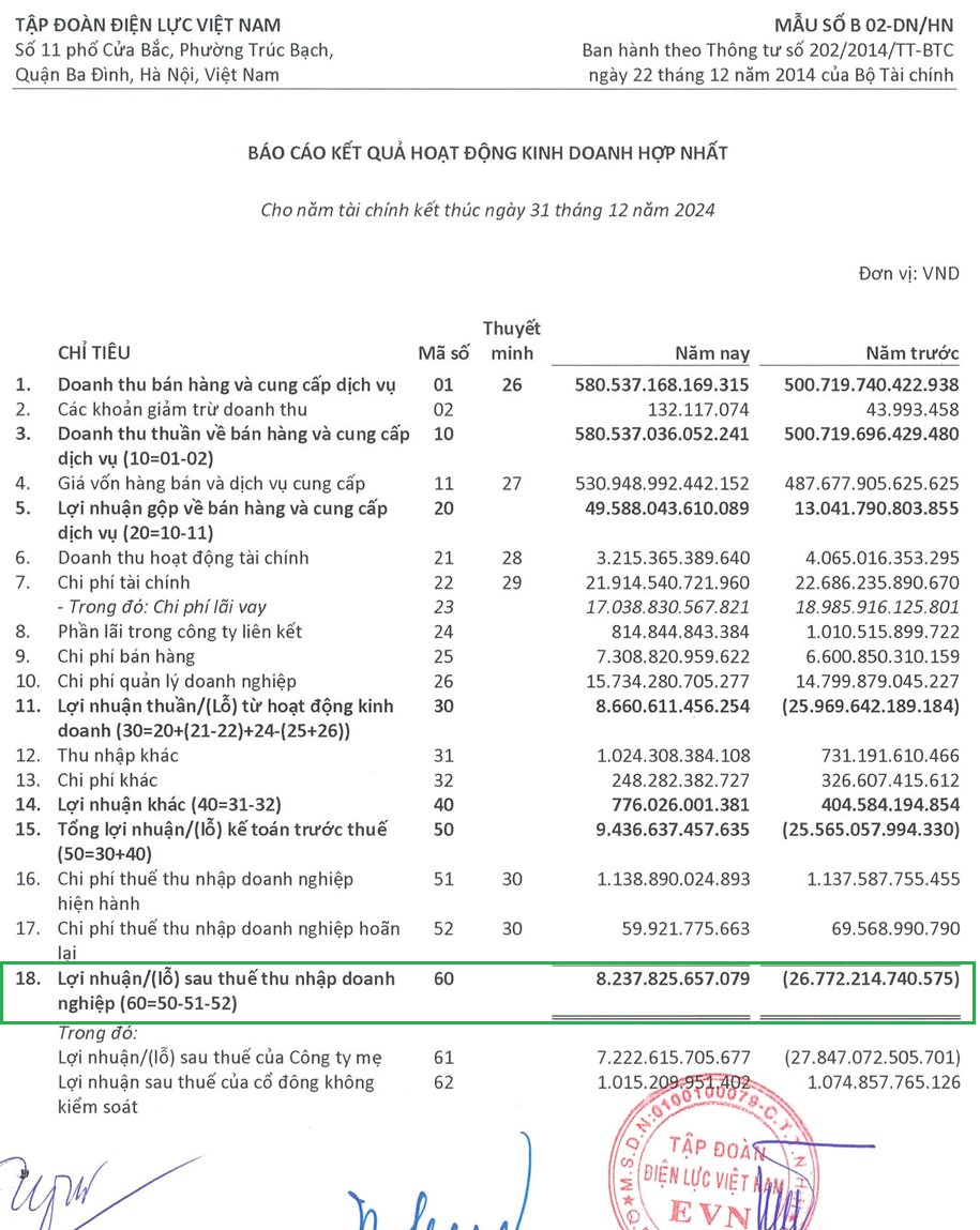 Tập đoàn Điện lực Việt Nam (EVN) vừa công bố báo cáo tài chính hợp nhất đã kiểm toán năm 2024, ghi nhận lợi nhuận sau thuế là 8.238 tỷ đồng.