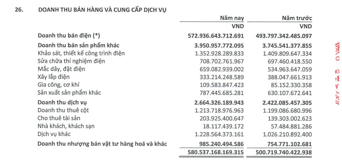 Báo cáo EVN cho thấy doanh thu bán điện chiếm phần lớn nhất, đạt 572.937 tỷ đồng, tương đương 98,7% tổng. Các doanh thu còn lại gồm bán sản phẩm (như thiết kế công trình điện, xây lắp điện, mắc dây, đặt điện) khoảng 3.951 tỷ đồng, dịch vụ (như nhà khách, khách sạn, thuê cột) khoảng 2.664 tỷ đồng, và các doanh thu khác.