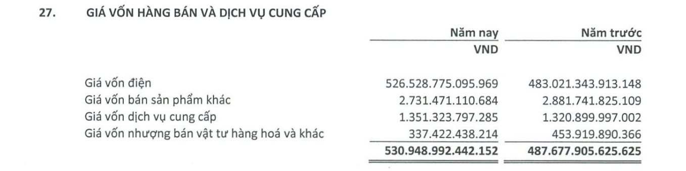 Doanh thu của EVN tăng mạnh 15,9% trong năm 2024, trong khi giá vốn của tập đoàn tăng nhẹ hơn ở mức 8,9%, từ 487.678 tỷ đồng năm 2023 lên 530.949 tỷ đồng năm 2024.