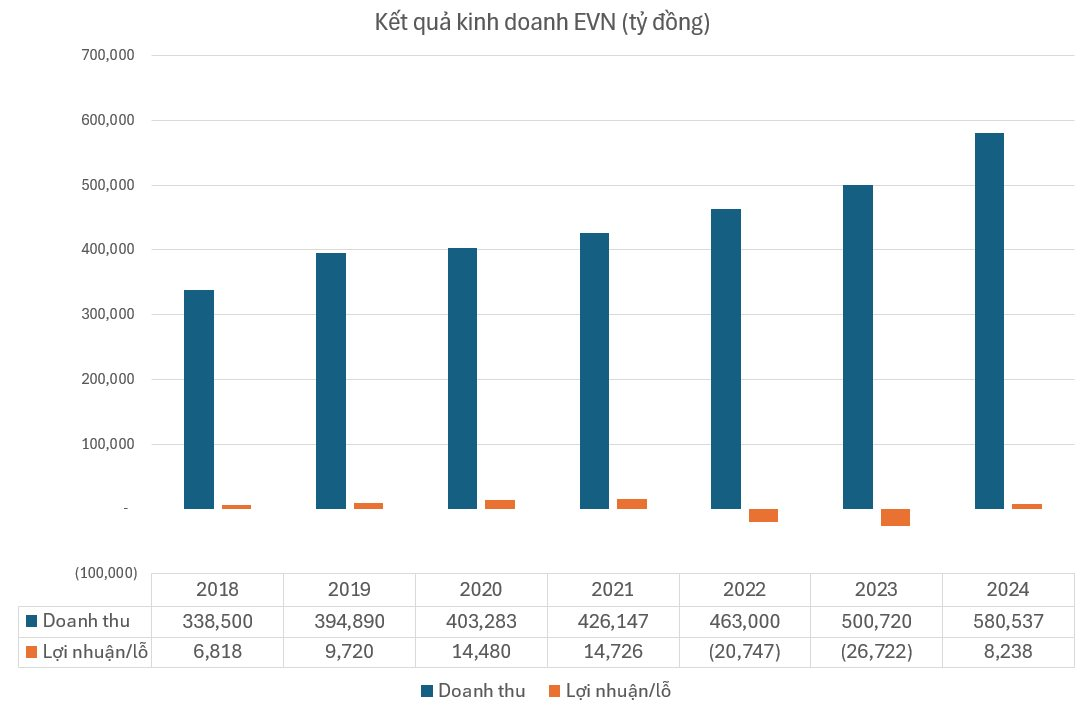 Ngoài ra, báo cáo tài chính của EVN cũng cho thấy doanh thu của tập đoàn tăng trưởng liên tục qua các năm, đạt 580.537 tỷ đồng năm 2024, tăng 15,9% so với cùng kỳ.