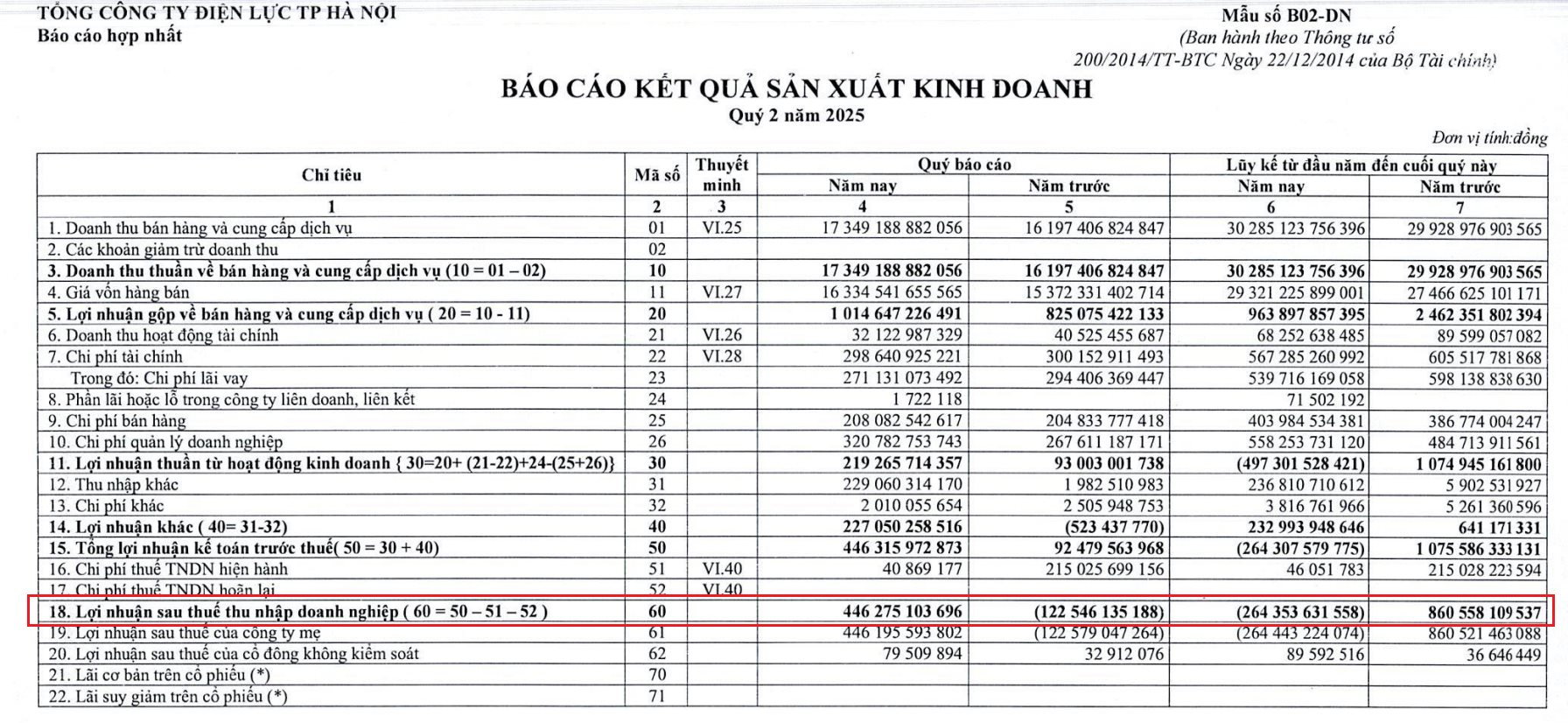 Công ty Điện lực TP. Hà Nội (EVNHANOI) vừa công bố báo cáo tài chính hợp nhất quý 2/2025, cho thấy doanh nghiệp ghi nhận lợi nhuận sau thuế là 446,3 tỷ đồng trong quý này, vượt trội so với lỗ 122,5 tỷ đồng trong quý 2/2024.