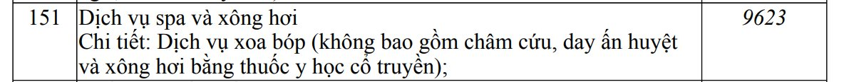 Một ngành cũ ở đăng ký là Dịch vụ tắm hơi, massage và các dịch vụ tăng cường sức khoẻ tương tự (mã 9610) đã không còn. Một ngành tương tự mới xuất hiện là Dịch vụ spa và xông hơi (mã 9623).