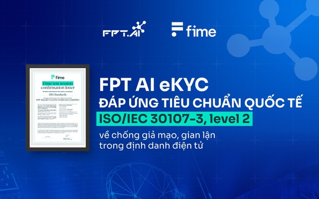 Giải pháp định danh điện tử FPT AI eKYC chính thức được xác nhận tuân thủ đáp ứng ISO/IEC 30107-3 Level 2, được cấp bởi FIME, tổ chức kiểm định uy tín và khắt khe bậc nhất về chống giả mạo sinh trắc học trên thế giới.