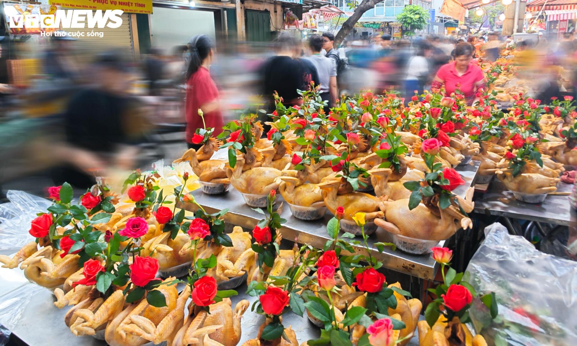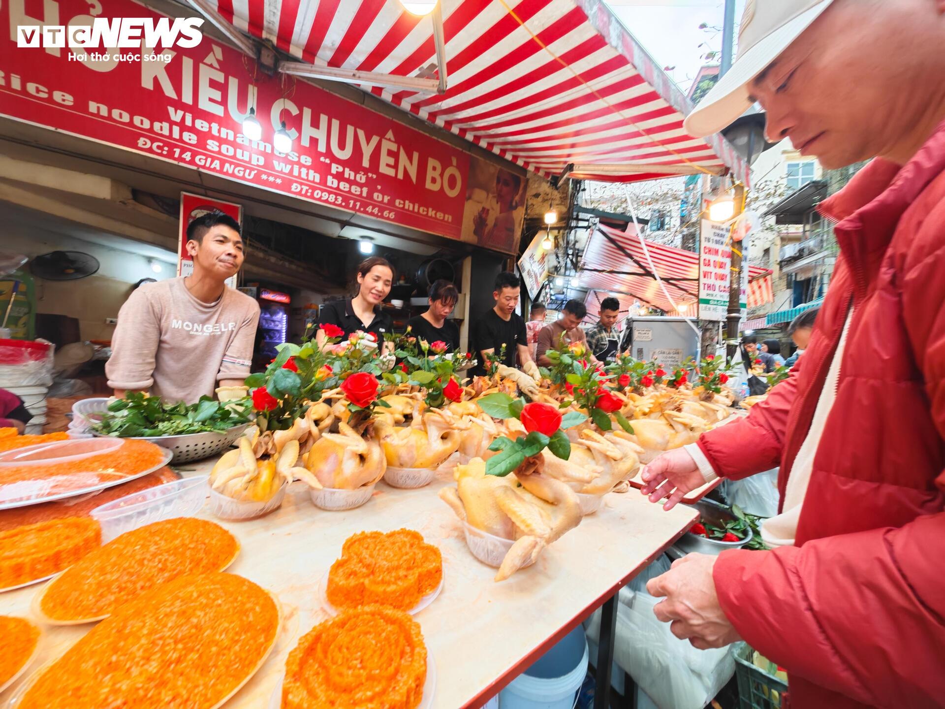 Đáng chú ý, nhiều mâm gà luộc vàng óng được đặt ở vị trí dễ nhìn, giá dao động từ 600.000 đồng đến gần 1,8 triệu đồng mỗi con, tùy kích cỡ và yêu cầu trình bày.