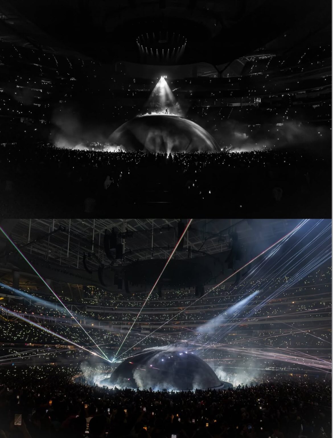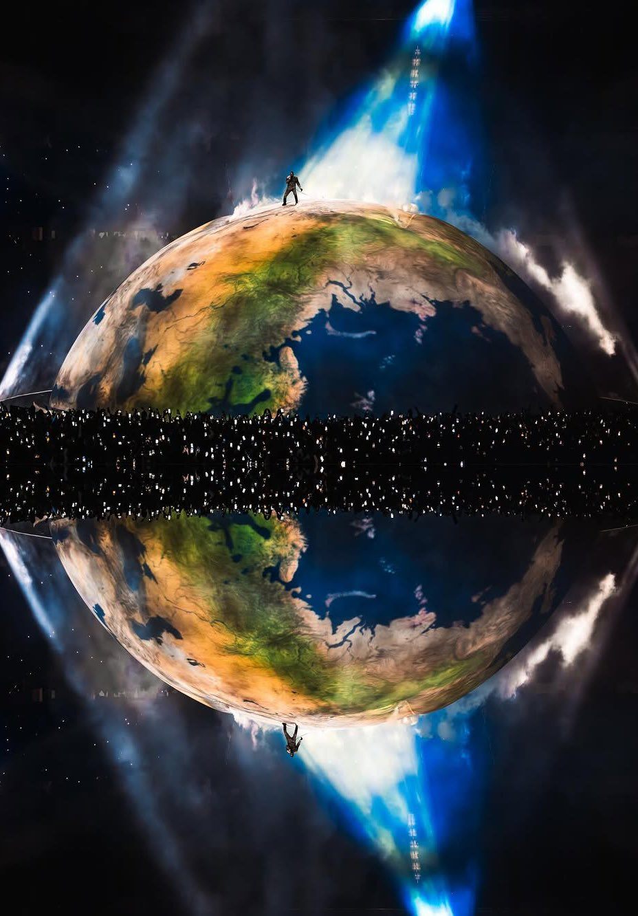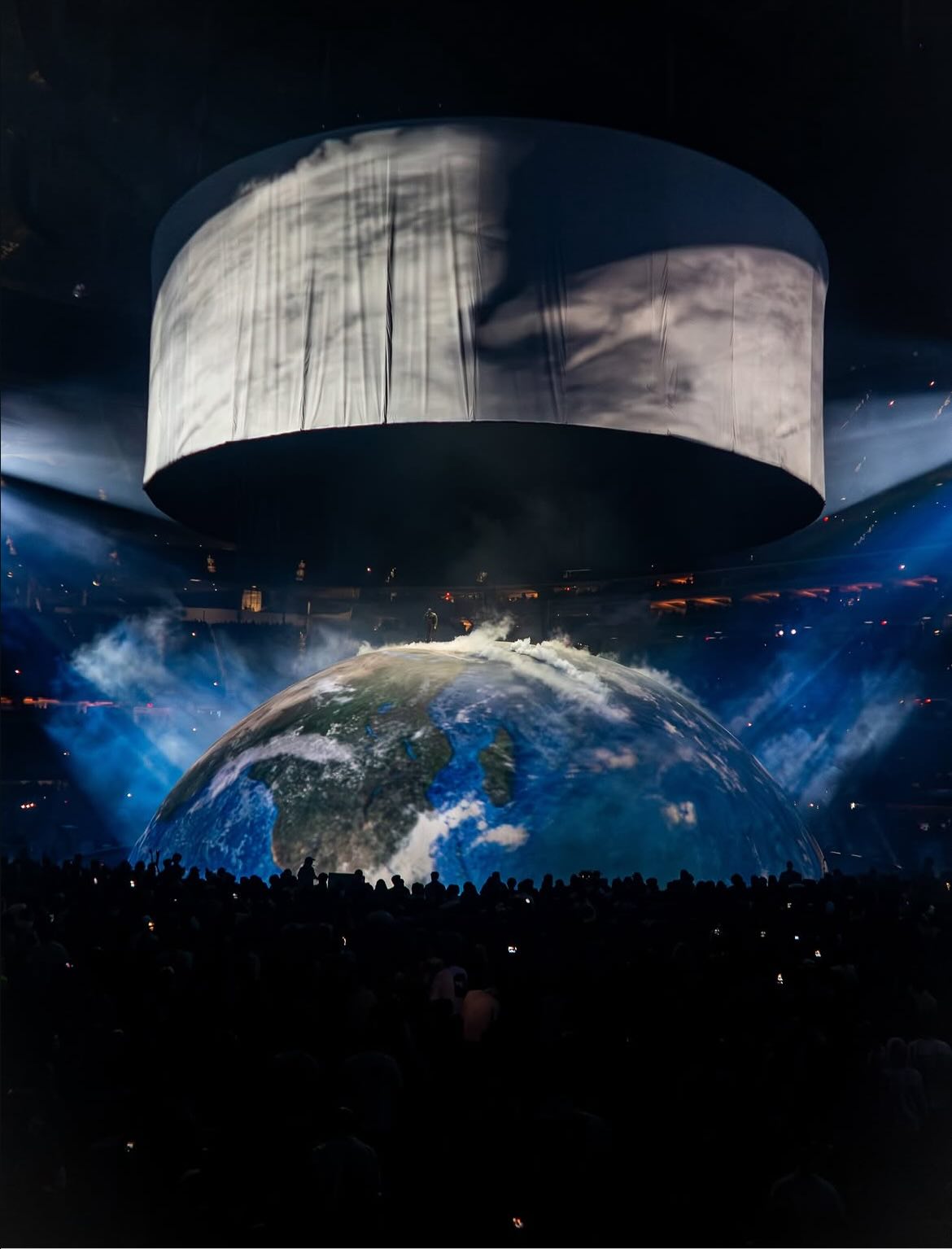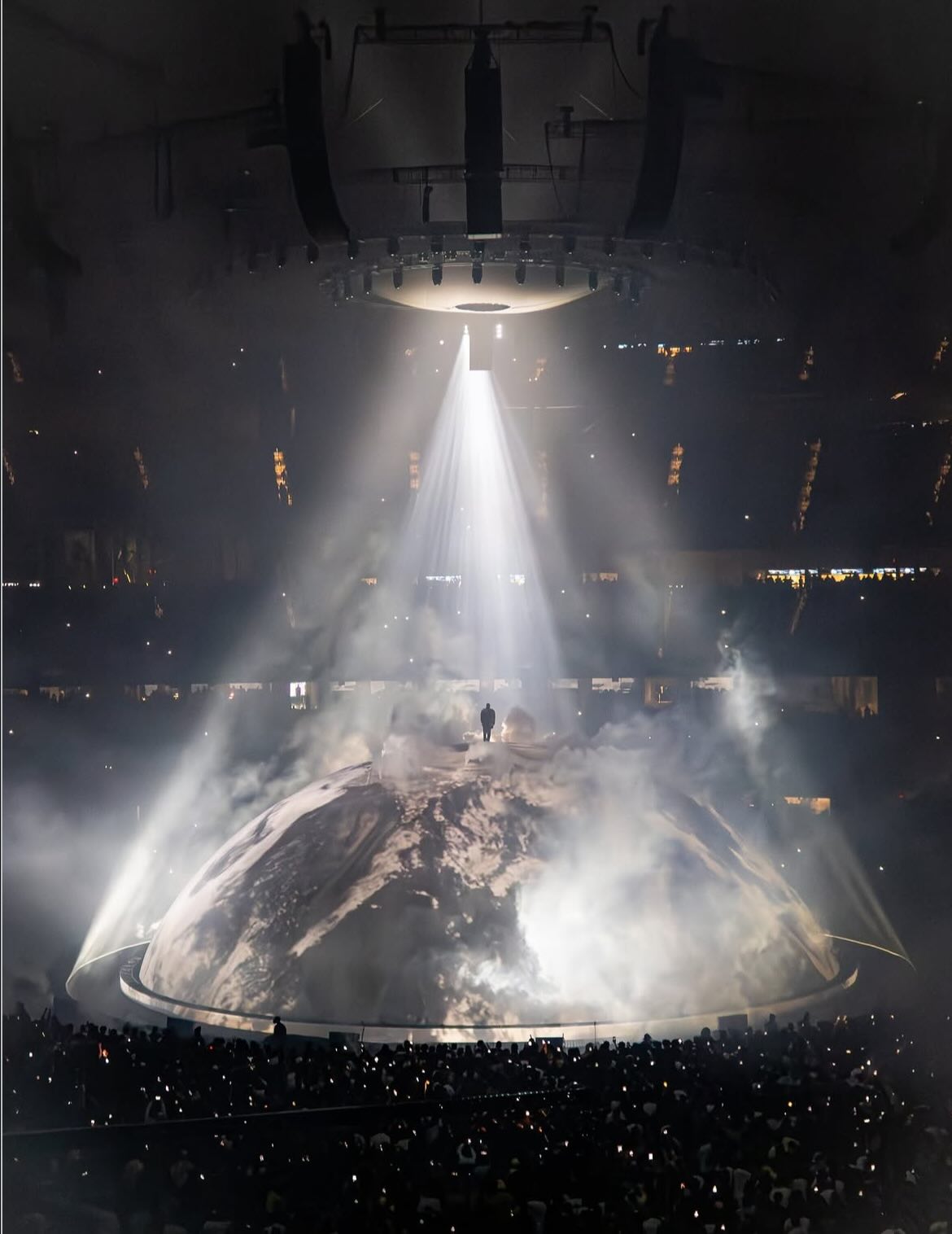 Đêm diễn tại SoFi Stadium đánh dấu màn tái xuất lớn của Ye trên đất Mỹ sau nhiều năm vắng bóng. Thay vì một concert thông thường, anh tiếp tục biến nó thành một “tác phẩm nghệ thuật sống”. Trung tâm sân khấu là concept mang tên “The Giant Earth” - một mô hình Trái Đất khổng lồ được dựng bằng hệ thống LED phức tạp, liên tục xoay chậm và biến đổi bề mặt hình ảnh. Không có vũ công, không dàn dựng đông người, toàn bộ không gian gần như bị “rút gọn” về mức tối thiểu. Giữa sân vận động khổng lồ, chỉ có một con người đứng trên đỉnh thế giới, giữa khói dày đặc và ánh sáng lạnh phủ kín. Hình ảnh đó được nhiều khán giả mô tả như “một con kiến đơn độc trên gò đất kỹ thuật số” - nhỏ bé nhưng mang tính biểu tượng mạnh mẽ, gợi cảm giác cô lập, bất an và lạc lõng.