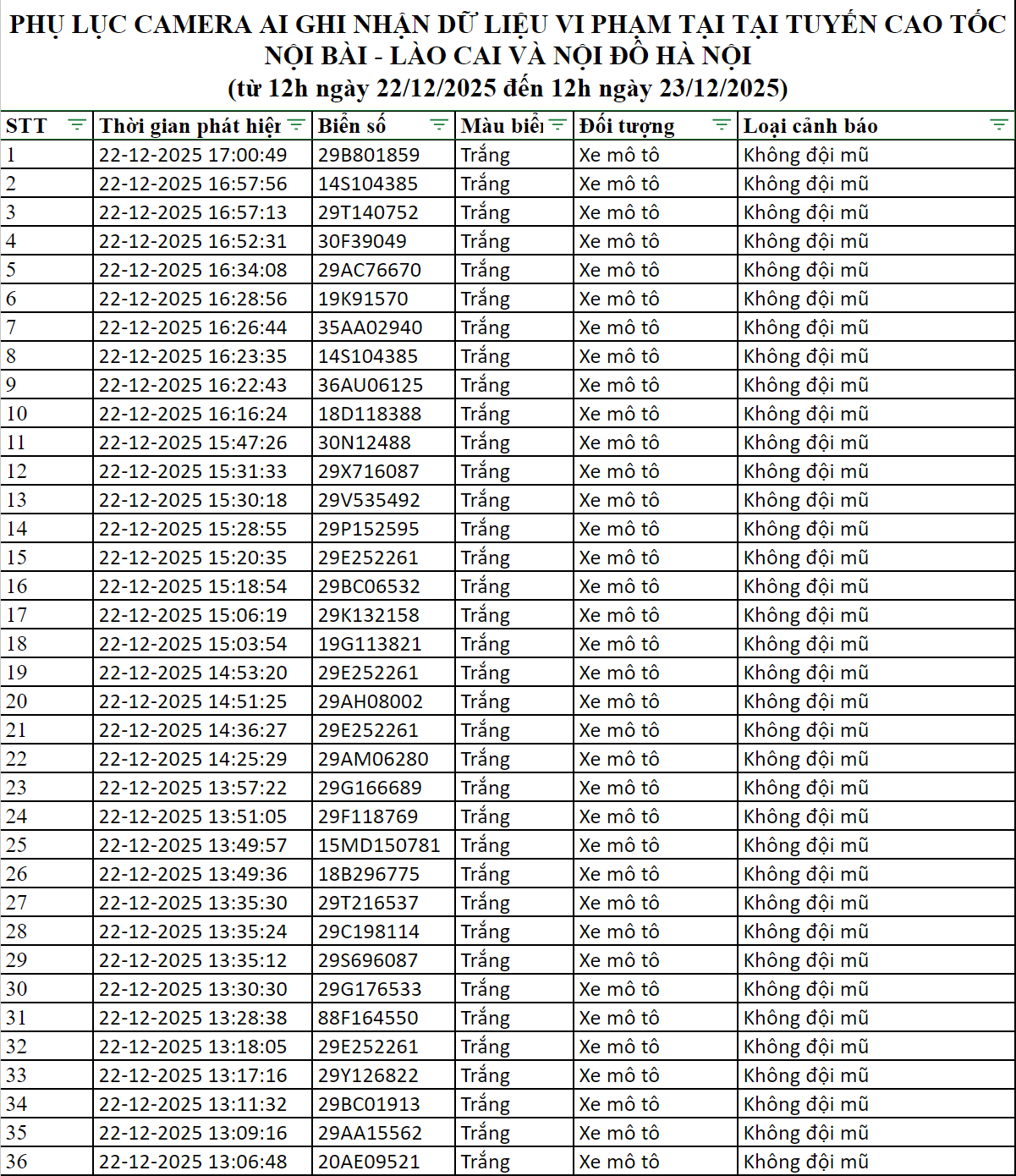 Cục Cảnh sát giao thông thông báo, từ 12h00’ ngày 22/12/2025 đến 12h00’ ngày 23/12/2025, Camera A.I tại km 20 tuyến cao tốc Nội Bài -Lào Cai ghi nhận có 10.269 phương tiện đi qua với tốc độ trung bình là 77 km/h. Đồng thời phát hiện: 06 trường hợp không thắt dây đai an toàn. Các trường hợp vi phạm này đều được thông tin tới chủ phương tiện để xử lý theo quy định.