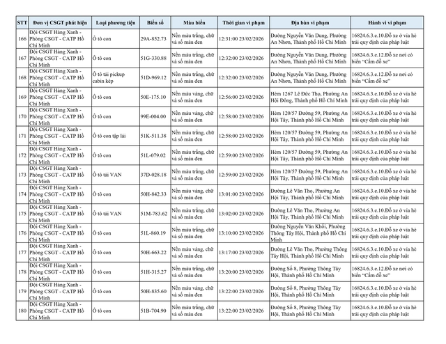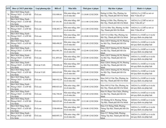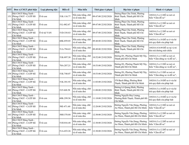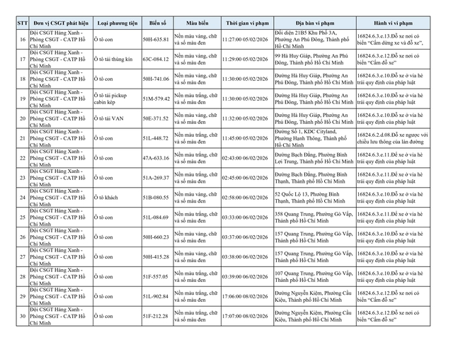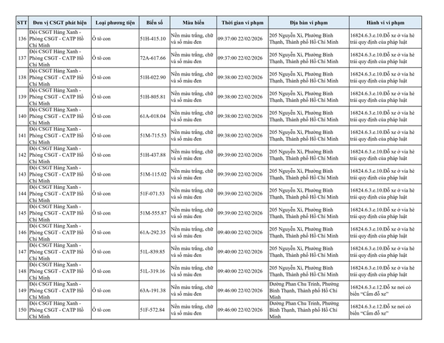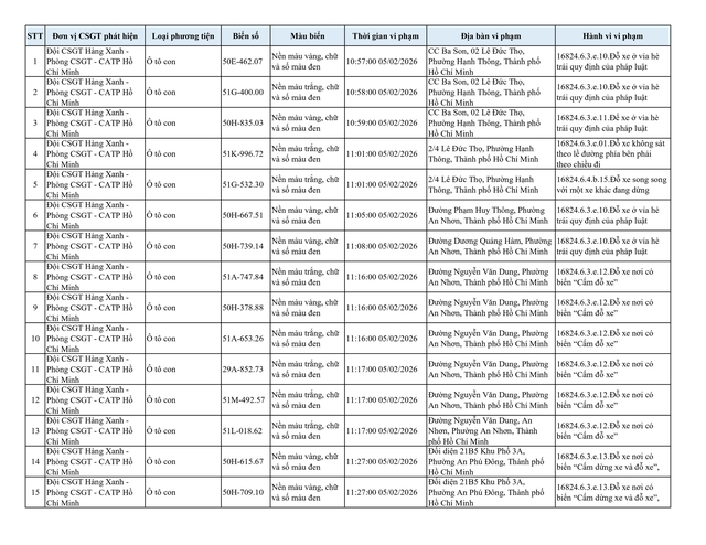 Chiều 2.3, Đội CSGT Hàng Xanh (thuộc Phòng CSGT – PC08 Công an TP.HCM) thông tin về danh sách phương tiện vi phạm lỗi dừng, đỗ không đúng quy định đã bị lực lượng chức năng ghi nhận và xử lý qua hình ảnh.