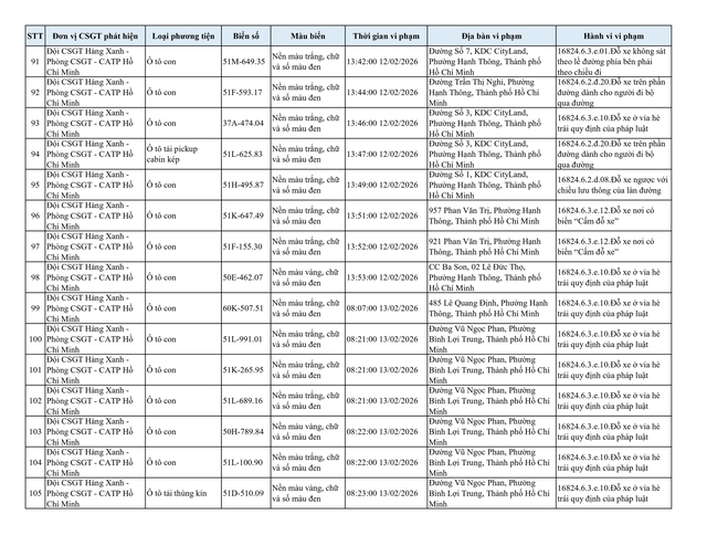 Thống kê trong tháng 2.2026 cho thấy, bên cạnh hoạt động tuần tra, kiểm soát và lập biên bản trực tiếp đối với 313 trường hợp ô tô vi phạm, lực lượng chức năng còn ghi hình và gửi thông báo phạt nguội đối với 209 phương tiện mắc lỗi tương tự dưới đây:
