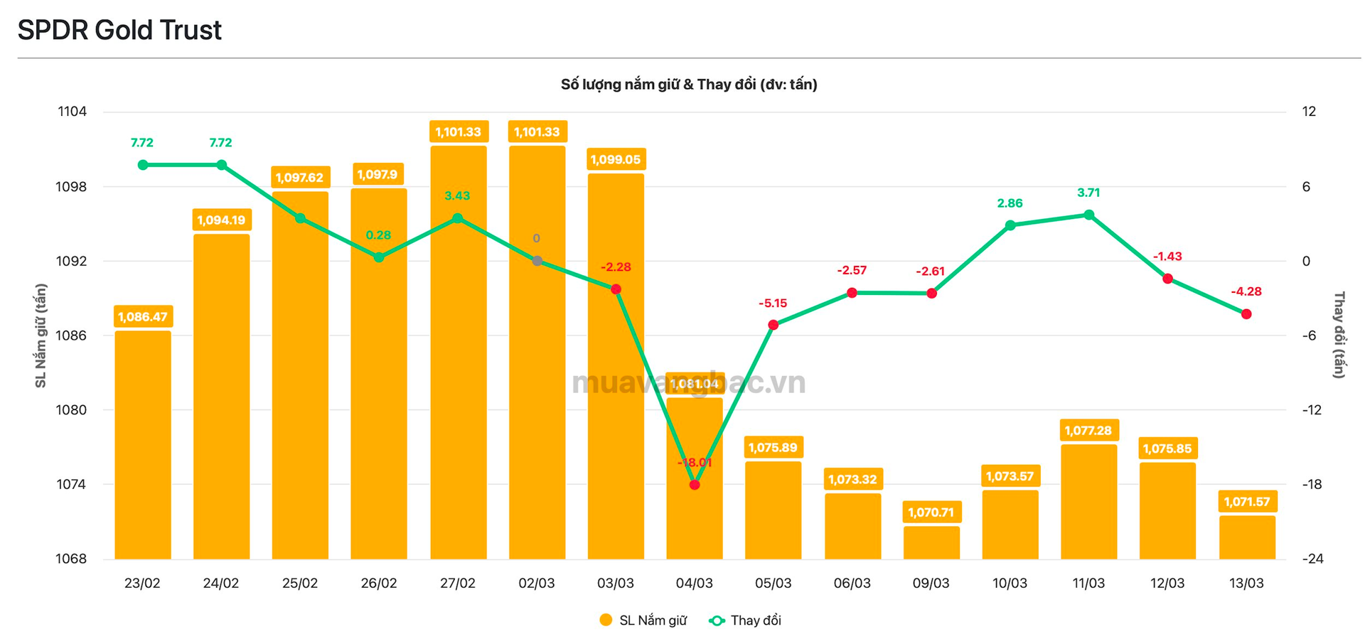 Theo cập nhật từ Muavangbac.vn, quỹ vàng lớn nhất thế giới SPDR Gold Trust tiếp tục bán ra hơn 4,2 tấn vàng trong ngày 13/3, ghi nhận ngày thứ 2 liên tiếp xả hàng. Tính từ đầu tháng 3, SPDR đã bán ròng gần 30 tấn vàng qua đó giảm lượng sở hữu xuống còn gần 1.072 tấn, tương ứng khoảng 180 tỷ USD.