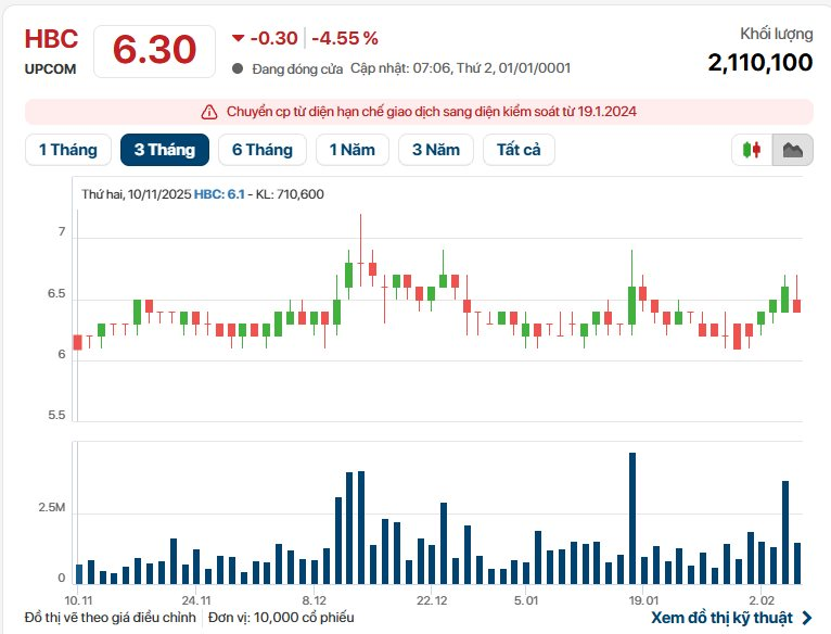 Trên thị trường chứng khoán, kết phiên 06/2, giá cổ phiếu HBC ở mức 6.300 đồng/cổ phiếu, giảm 4,55% so với phiên trước, khối lượng cổ phiếu giao dịch khớp lệnh đạt hơn 2,1 triệu đơn vị.