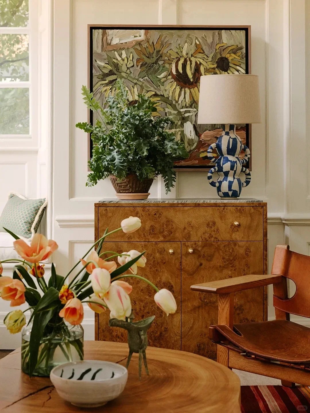 Bí quyết nằm ở sự cân bằng. Giữa những mảng màu trầm mặc của gỗ, của vải nhung, họ điểm xuyết những bình hoa tươi rực rỡ, những chậu cây xanh mướt vươn mình đón nắng. Chính sự kết hợp giữa "Tĩnh" (nội thất) và "Động" (cây cỏ, hoa lá) đã đánh thức sinh khí cho cả căn phòng. Nhìn vào đó, ta thấy mùa xuân đang len lỏi trong từng ngóc ngách, không ồn ào nhưng đủ làm bừng sáng cả tâm hồn.