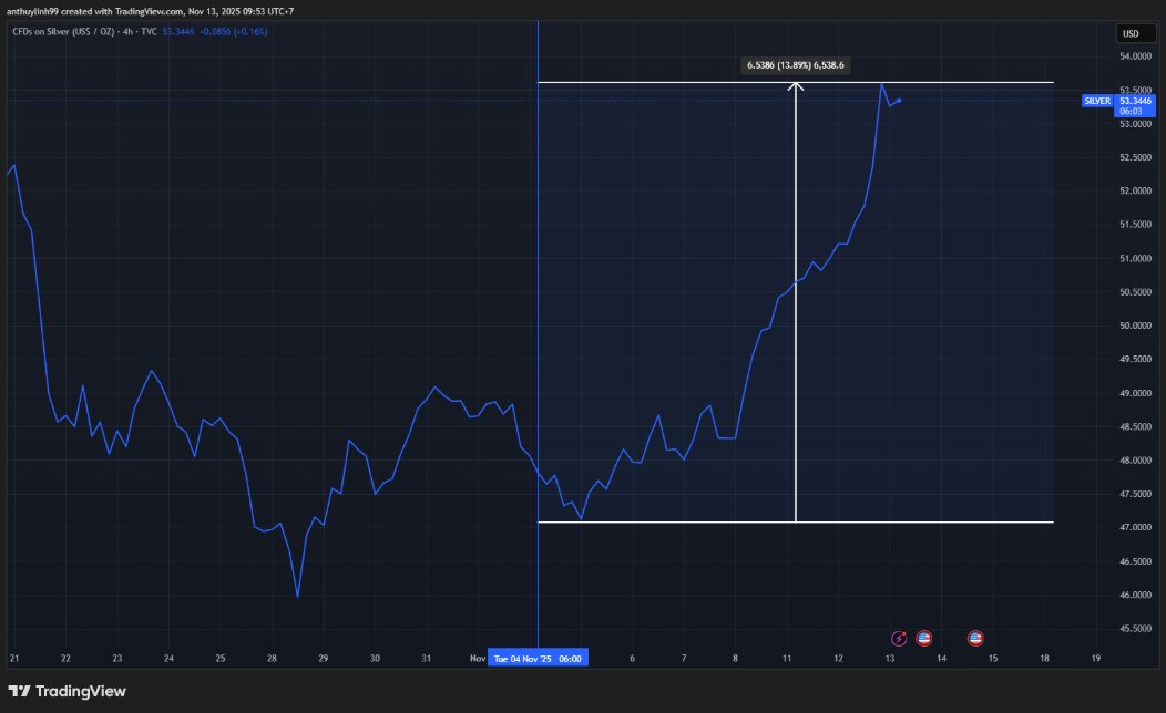 Sau đà chốt lời và suy yếu vừa qua, giá bạc đã có đầu tháng 11 phục hồi mạnh mẽ, quay trở lại xu hướng tăng trước đó. Tính đến ngày 13/11, giá bạc đã phục hồi 14% từ mức đáy và giữ được mức hiệu suất đầu tư hơn 84% trong năm 2025. Hiệu suất này vượt qua hầu hết các loại tài sản khác trong năm nay.