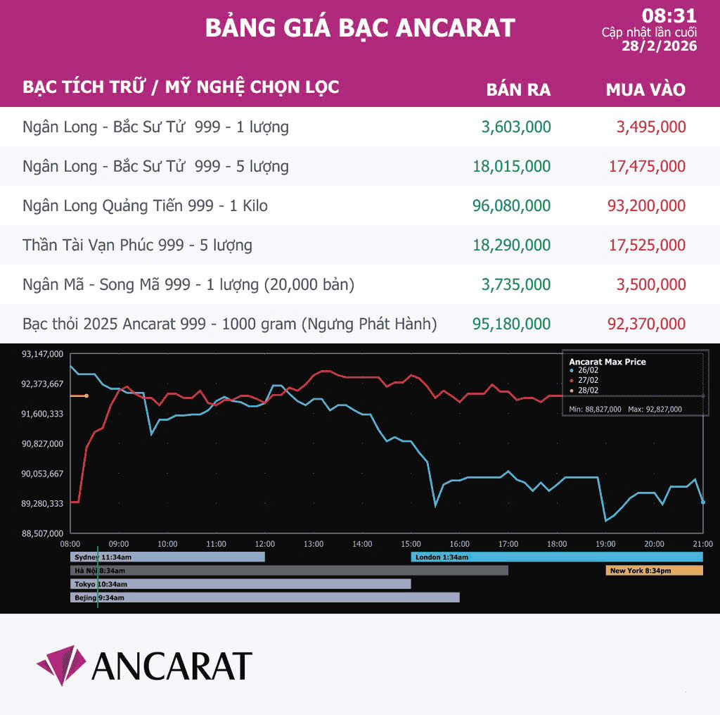 Đối với bạc kg, giá tăng thêm hàng triệu đồng so với ngày trước. Ancarat giao dịch bạc kg mua vào 93,2 triệu đồng, bán ra 96 triệu đồng; Phú Quý bán ra 96,34 triệu đồng/kg.
