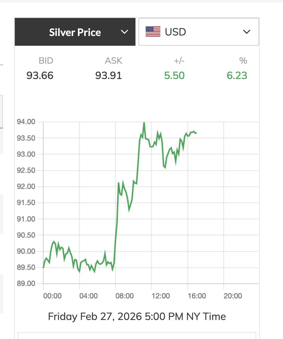Ngày 28-2, giá bạc thế giới chốt tuần giao dịch ở mức 93,91 USD/ounce, tăng tới 6,23% so với phiên trước. Đây là mức tăng rất mạnh của bạc trong những ngày qua.
